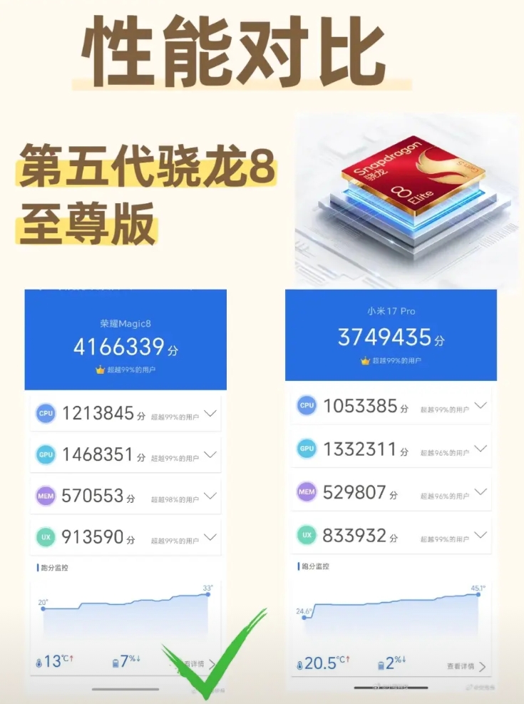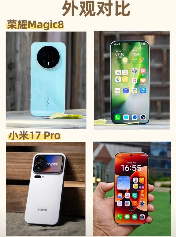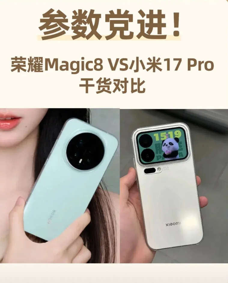 参数党进!荣耀Magic8 VS小米17 Pro干货对比 刚摸完小米 17Pro又刷到荣耀Magic8预热,作为常年蹲旗舰的参数党直接陷入选择困难… 我先扒点干货给同样纠结的姐妹! 芯片上俩都是第五代骁龙8至尊版,小米实测安兔兔能跑370万分。但荣耀Magic8也是首批搭载,参考去年荣耀Magic7的调度优化,这次标准版说不定能把芯片潜力榨得更足,毕竟上代就靠调校赢过不少同芯片机型,这次真有可能反超? 功能上差异挺明显:小米的妙享背屏能预览自拍、控智能家居,新鲜感拉满,确实是锦上添花;而荣耀Magic8的AI键和YOYO助手感觉更实用,比如有AI护眼模式,对我这种熬夜刷手机的太刚需,青海湖大电池也能有AI优化功耗,虽然还没具体的续航数据,但相比小米17 Pro的6300mAh的电池说不定更抗造。 影像方面小米徕卡三摄白天出片很有味道,5倍长焦拍远景够清晰,但暗光下解析力会打折;荣耀Magic8主打最强潜望长焦,还加了AI追色的功能,从拍照到修图全搞定 最戳我的是外观!小米17 Pro的森野绿质感不错,但荣耀Magic8的天青釉配色直接长在我审美上,汝瓷开片的蝉翼纹太绝了,比普通玻璃后盖有质感,而且还是最窄边框小直屏,手感应该更顺手。 现在就蹲10月15号荣耀Magic8发布!感觉会带来大惊喜