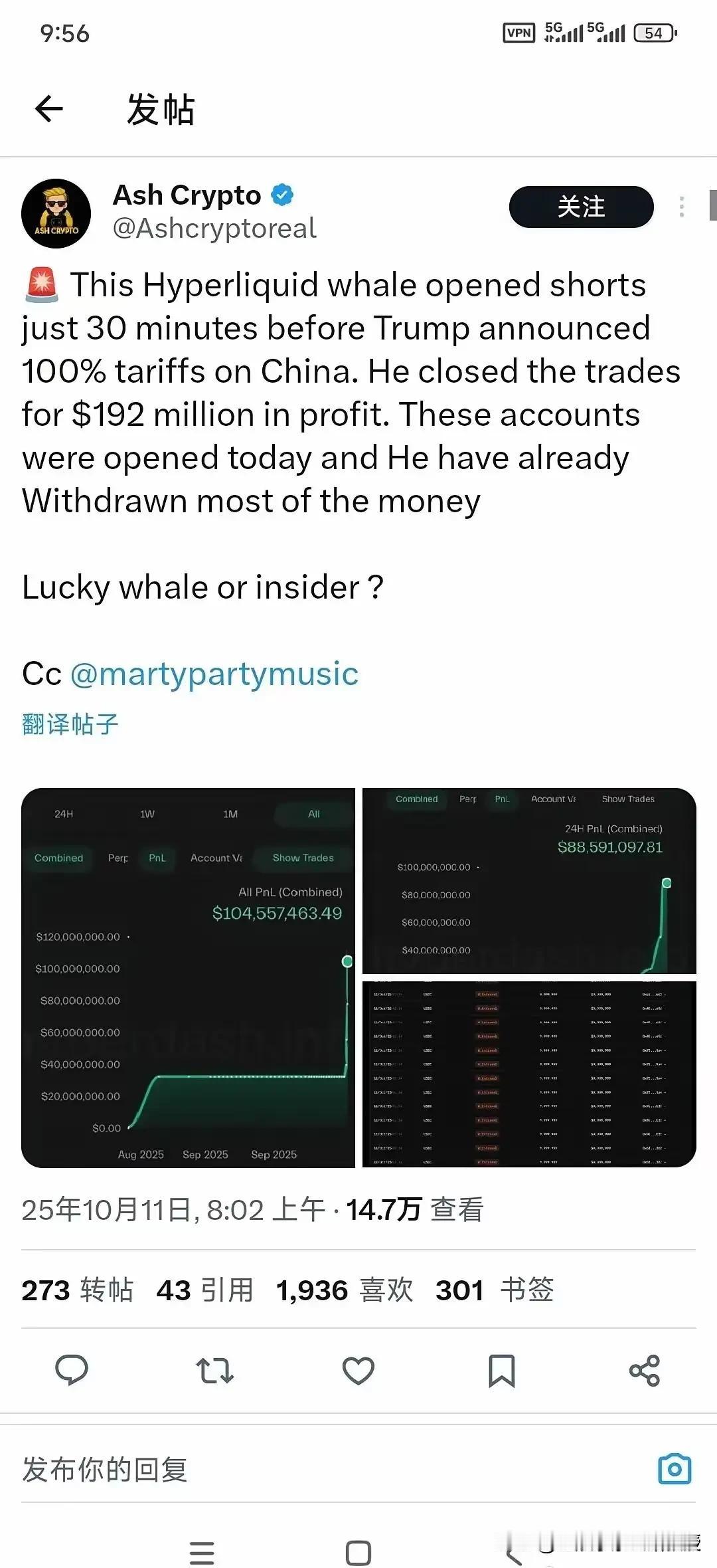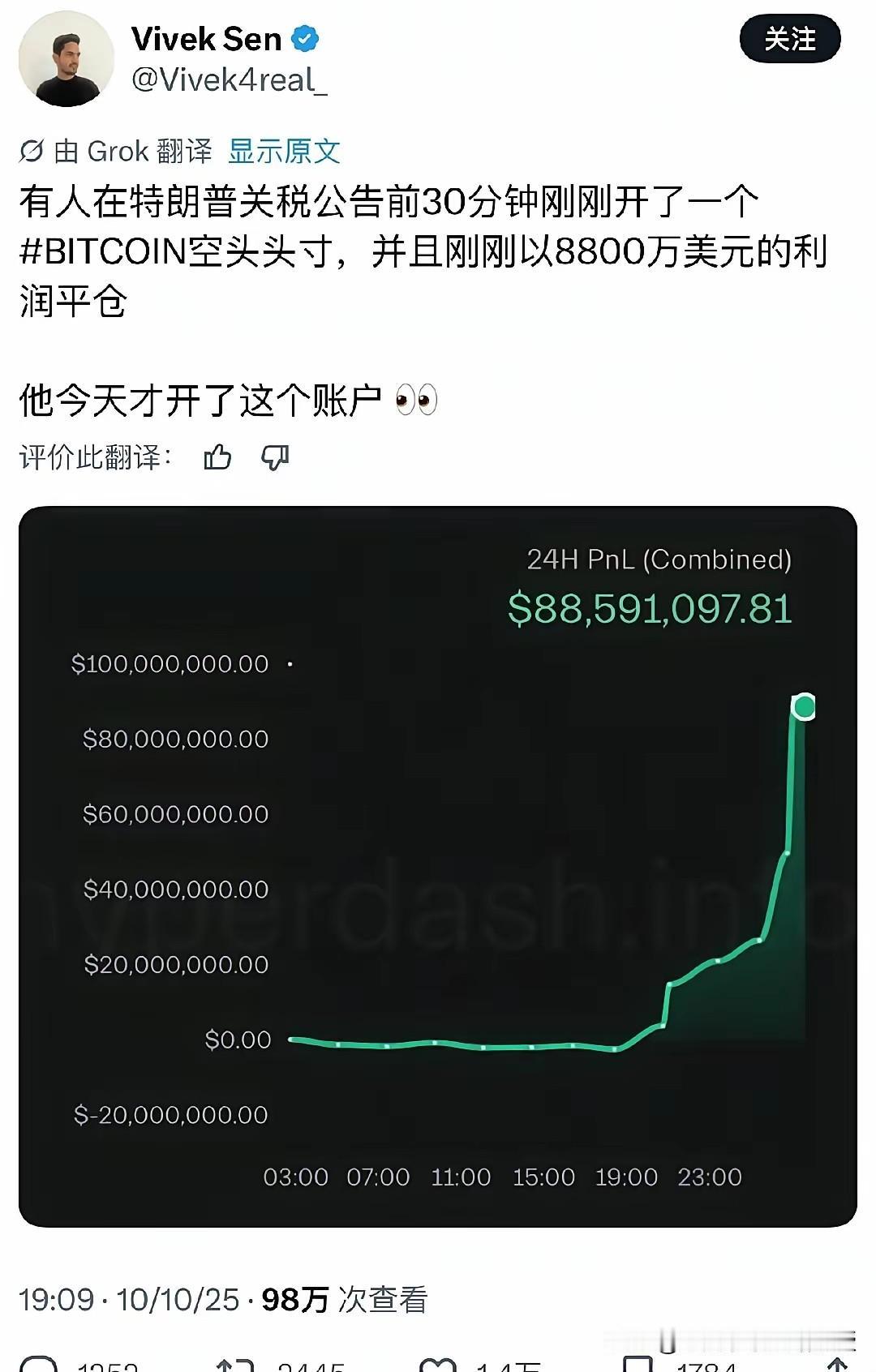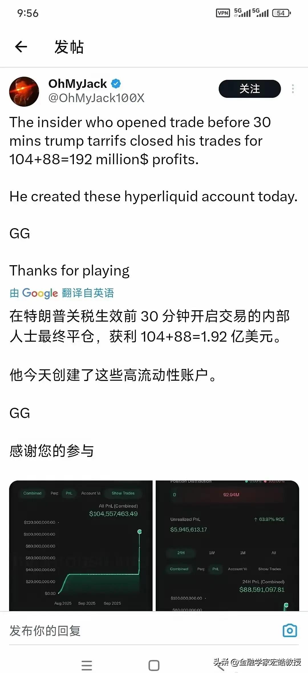 上次是特朗普女婿,这次是特朗普小儿子巴伦。 据《福布斯》媒体报道,巴伦在加密货币中已经赚了8000万美金,另外在特朗普发布加关税消息的30分钟前,有人平仓获利1.92亿美元,而且账户还是刚建的。这是不是巴伦在大学赚得的第一桶金?向父亲特朗普证明自己的赚钱能力也不比其他孩子差。 这样的操作已经驾轻就熟了。2025年4月特朗普加关税,他女婿库什纳控制的Affinity基金同步做空苹果、特斯拉等科技股,大赚了57亿美元。 这算不算数内幕交易,在中国肯定算。至于在美国,特朗普执政时期,没有人敢说他,他知道自己言语的分量,每隔一段时间从加密货币或股市赚钱,至于三年后下台了,会不会遭人总清算,这个还真不好说。 特朗普前几天还为自己代言的联名手表出镜打广告,真的是金融实业两不误,还想把自己头像印在250元的美元上,特朗普要把总统这个头衔能实现的利益尽可能最大化。[捂脸]