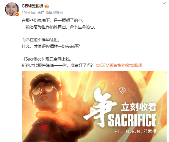 虎扑10月13日讯由邓紫棋演唱的2025全球总决赛主题曲《Sacrifice》现已上线,歌手邓紫棋发文: