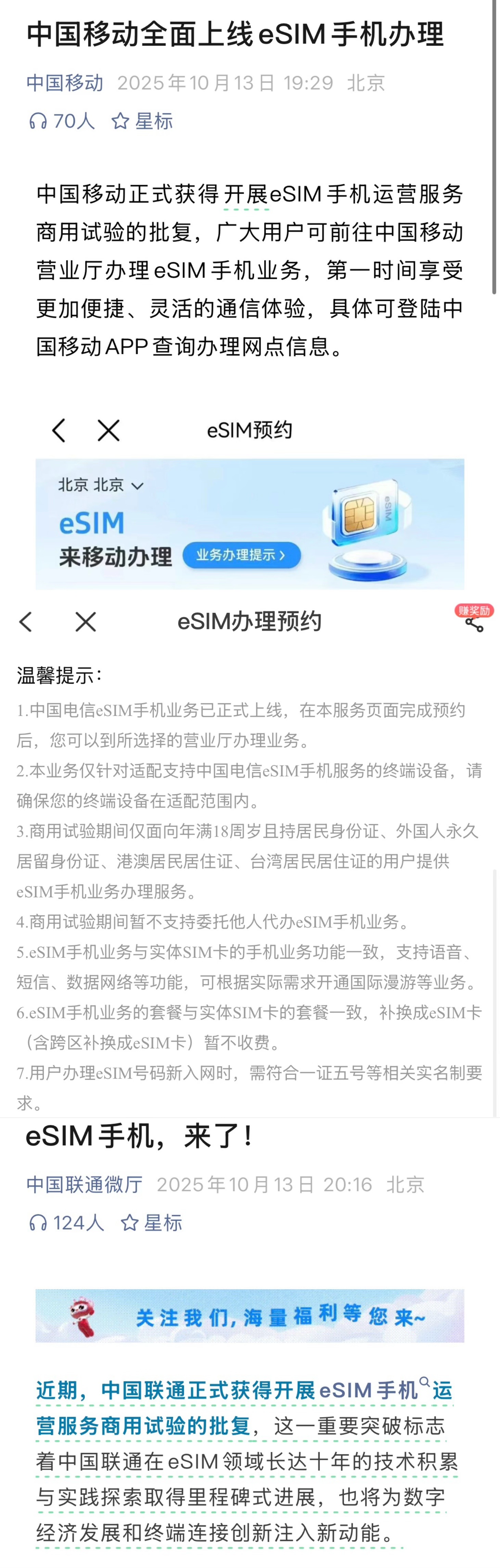 #三大运营商eSIM手机业务上线#[#eSIM手机业务可以办理了#]中国移动、中国联通先后宣布,正式获得开展eSIM手机运营服务商用试验的批复。经查询中国电信APP发现中国电信也已可以办理相关业务。