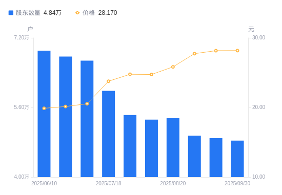 日期A股户数(户)流通A股户均持股数(股)户均持股市值(万元)2025-09-304838922799.7364.232025-09-104895222537.5063.472025-08-294954322268.6561.752025-08-205352520611.9753.242025-08-085321920730.4951.292025-07-315427420327.5250.352025-07-185981218445.3943.842025-06-306676516524.4733.922025-06-206770116296.0032.822025-06-106907015973.0031.75