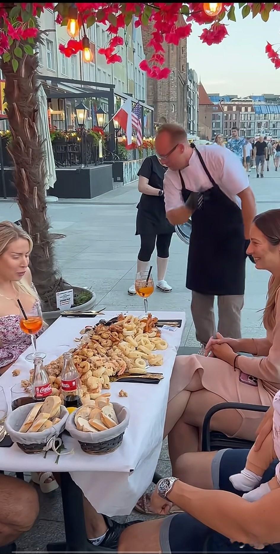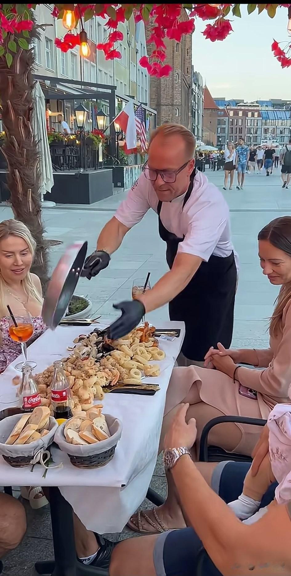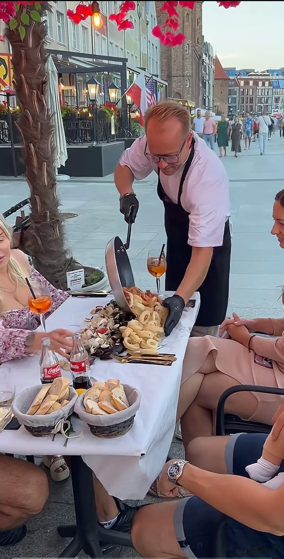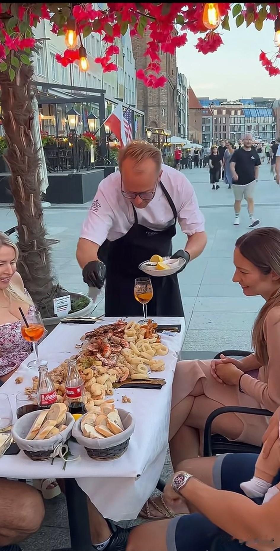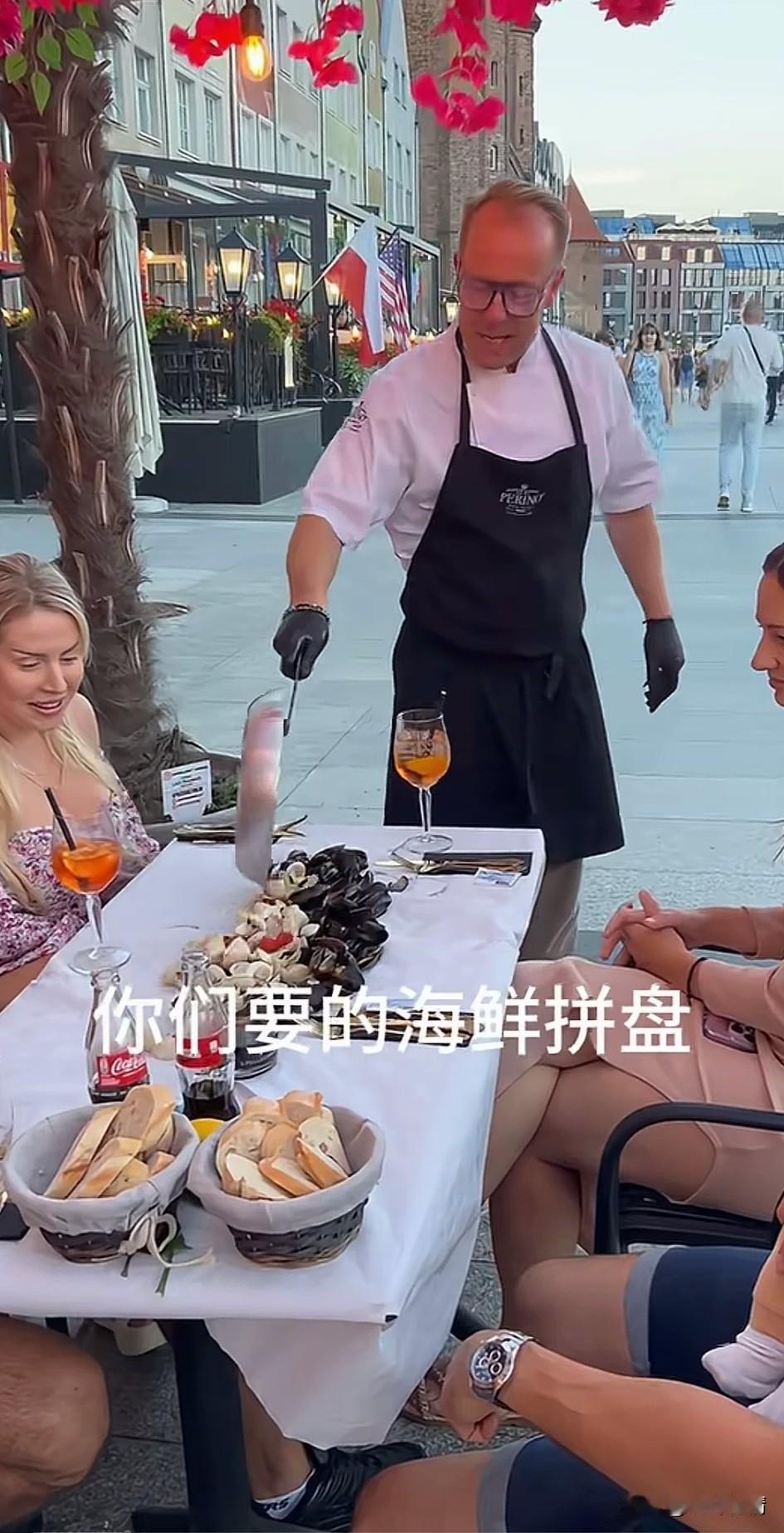 意大利街头美食海鲜拼盘, 只见老板很优雅的拿着两个平底锅上菜了,没有餐具,直接倒在桌布上面, 老板倒完后直接把平底锅往地上一扔, 转身又去拿了两个平底锅, 然后开始再次倾倒, 一连反复倾倒了至少八九个平底锅, 小海鲜和土豆子, 最后才把大虾也倒了上去, 还用手套稍微挡了挡, 有些食材还是不小心掉地上了, 后面老板娘跟着老板把平底锅收一下, 最后老板撒了一些调料, 又去切了一个柠檬, 用手挤了柠檬汁撒在上面, 然后把柠檬放上去, 这就上完菜了, 还优雅的对客人鞠了一躬, 祝福客人用餐愉快, 不是说老外吃饭都是盘子加刀叉吗? 这咋有点像喂猪呢? 说好的餐桌礼仪呢? 也没有餐具, 看来是要用印度吃法了, 不愧是浪漫的意大利就餐! 抖音美食 钟爱异国美食 饮食文化 意大利餐馆