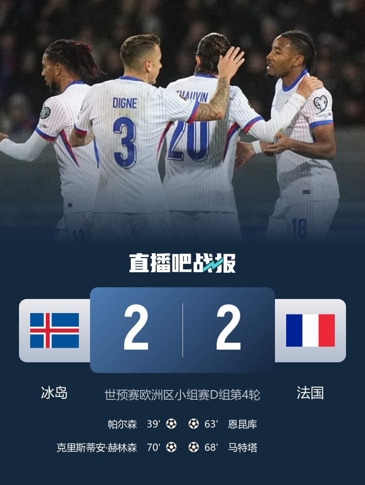 直播吧10月14日讯世预赛欧洲区小组赛D组第4轮,冰岛坐镇主场劳加达尔斯沃勒球场迎战法国。上半场,帕尔森先拔头筹。易边再战,恩昆库扳平比分,马特塔完成反超,赫林森破门。最终法国2-2冰岛。积分榜方面,法国10分领跑,冰岛4分。