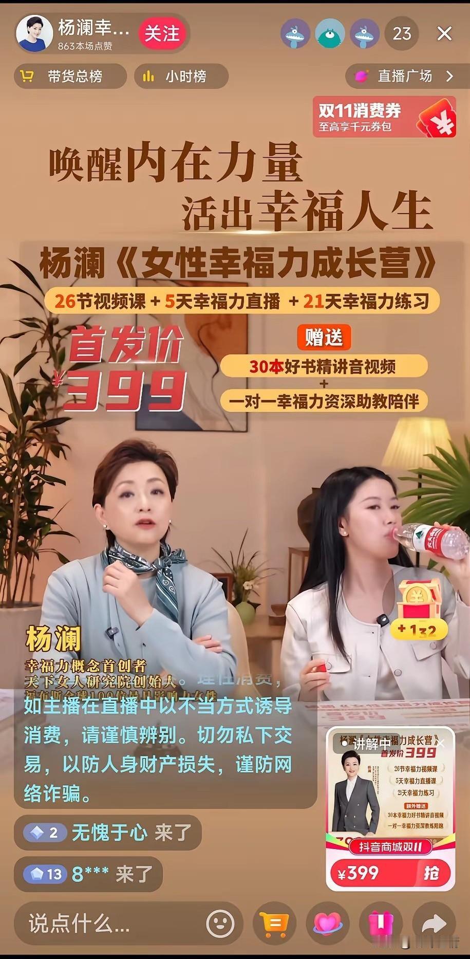 杨澜直播间只有 23个人, 还不如一个小网红直播间里面的人多, 她卖自己写的书《女性幸福力成长营》 主打唤醒内在力量, 活出幸福人生, 首发价399元, 按理说她在女性中算是有号召力的了, 可是真到让粉丝掏钱的时候, 还这没人买账了, 新韭菜现在也不好变现了, 23个粉丝观看, 里面还有几个自己人当托, 这播一天不觉得尴尬吗? 这书买了就真的可以记得女性潜力吗? 我看不然,这就是妥妥的智商税, 毕竟也不便宜, 粉丝也不是那么好忽悠的, 一天也没有人买, 大家觉得杨澜直播间卖自己的书为啥没人买? 抖音直播 杨澜 杨澜心得 读书成长直播间 杨澜歌曲