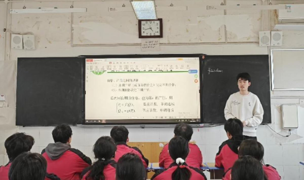 王倩倩老师组织同学们以4人一组进行讨论,每组发放一张任务卡,上面写着“如果你是一家水果种植企业的决策者,已知今年苹果价格较高,结合蛛网模型,你会如何安排明年的种植计划?”的问题。讨论环节中,同学们积极发言,思维的碰撞在教室里不断上演。