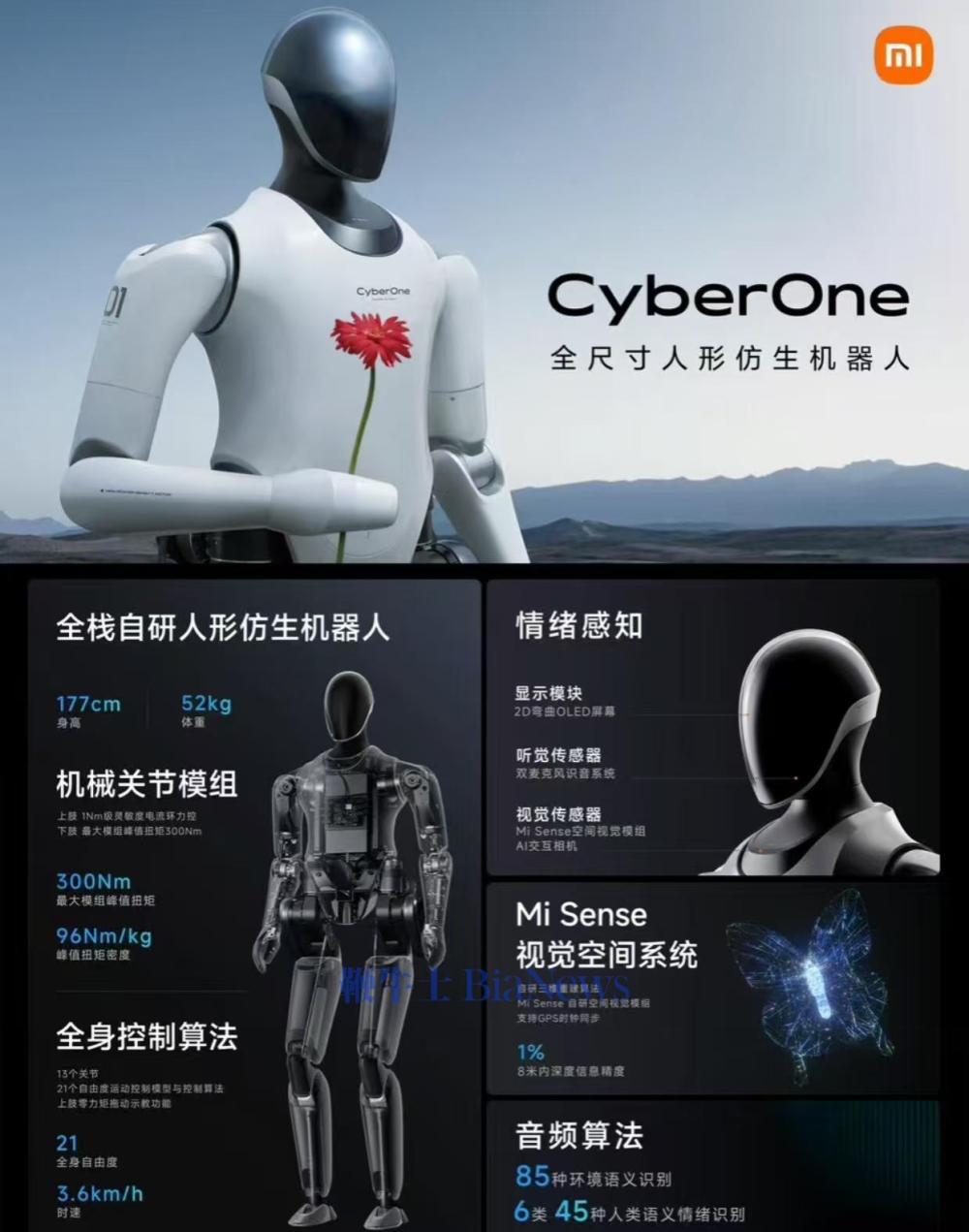 公开信息显示,CyberOne(中文名“铁大”)是小米2022年推出的首款全尺寸人形机器人,初代产品身高177cm、体重52kg,曾以情感识别、三维重建等功能亮相。