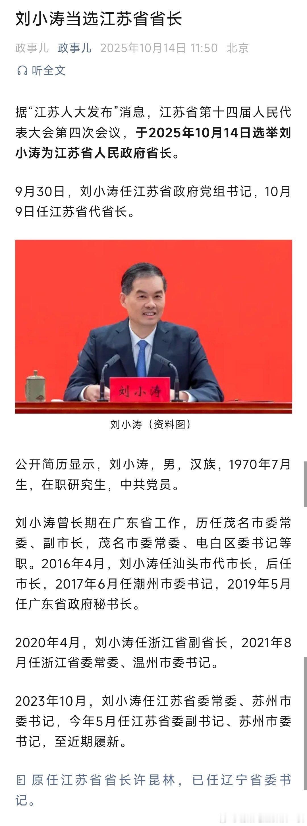 刘小涛当选江苏省长刘小涛当选江苏省省长。热点现场