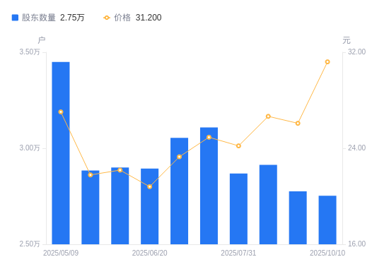 日期A股户数(户)流通A股户均持股数(股)户均持股市值(万元)2025-10-10275305386.9616.812025-09-19277605342.3313.932025-08-20291345090.3713.572025-07-31286875169.6912.512025-07-18310804771.6511.892025-06-30305394856.1811.312025-06-20289425124.1410.662025-06-10290005113.9011.342025-05-30288385142.6211.202025-05-09344914299.7611.62