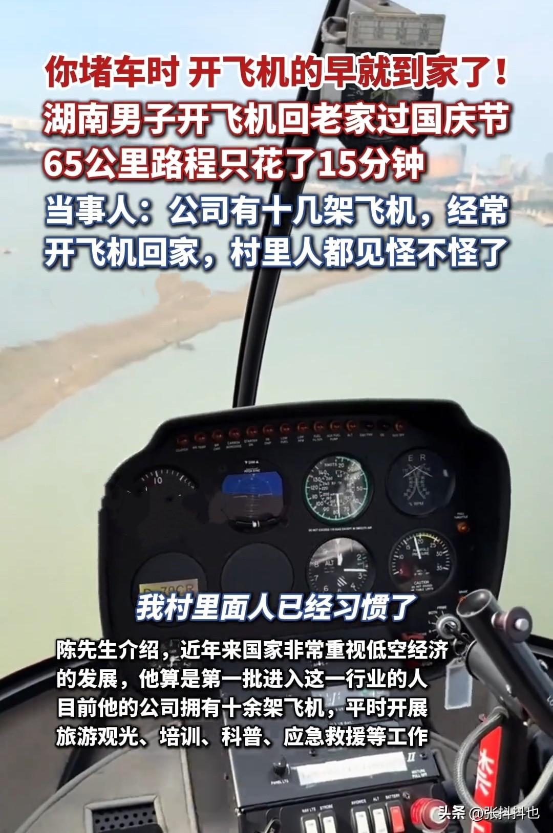 国庆大长假,当你在路上堵成狗时,有人却开着飞机回家,羡慕啊! 近日,湖南永州表兄妹俩开着直升飞机回老家的视频,一发出就让网友羡慕不已,而表兄妹俩老家的村民却已经见怪不怪了。 原来,表哥陈先生是第一批进入低空经济行业的人,公司有十几架飞机,平时用于旅游观光、科普、救援等。 这次国庆长假准备回家,公司到老家六十多公里,开车的话一个小时,如果遇到堵车就麻烦了,所以俩人干脆开了直升飞机回家,15 分钟就到了,非常方便。 不知道直升飞机要多少钱?飞65km花费多少钱?说一下,让我死心吧,然后乖乖挤火车或堵高速。 有网友流泪了:我小汽车都还没开上,别人飞机都开上了,差距是一万光年吗? 看着村口欢迎的人群,这是有钱人回家村口接,没钱人回家可能招呼都不会打吧? 只是这看上去很有脸面的事情,也非常快捷方便,安全还是要考虑一下哟。 还是努力做牛马吧,争取直升飞机普及的时候,也能攒钱买架飞机开开罗!