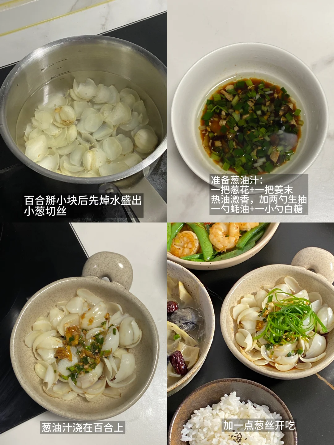 3)葱油汁浇在百合上,加点小葱丝即可