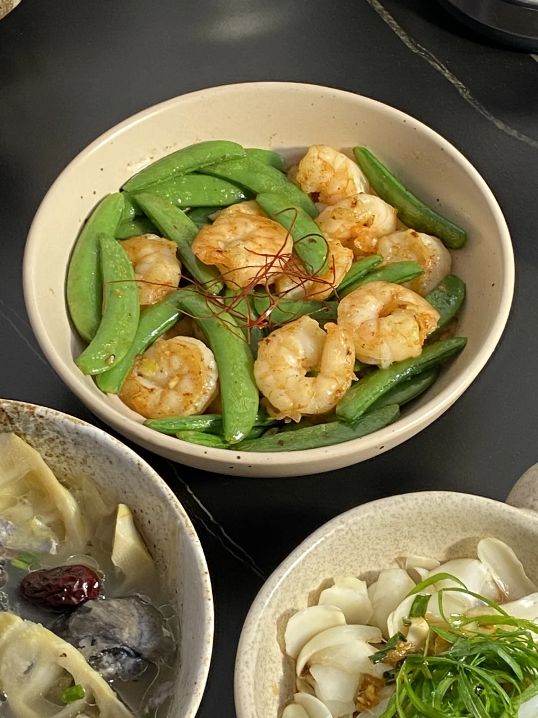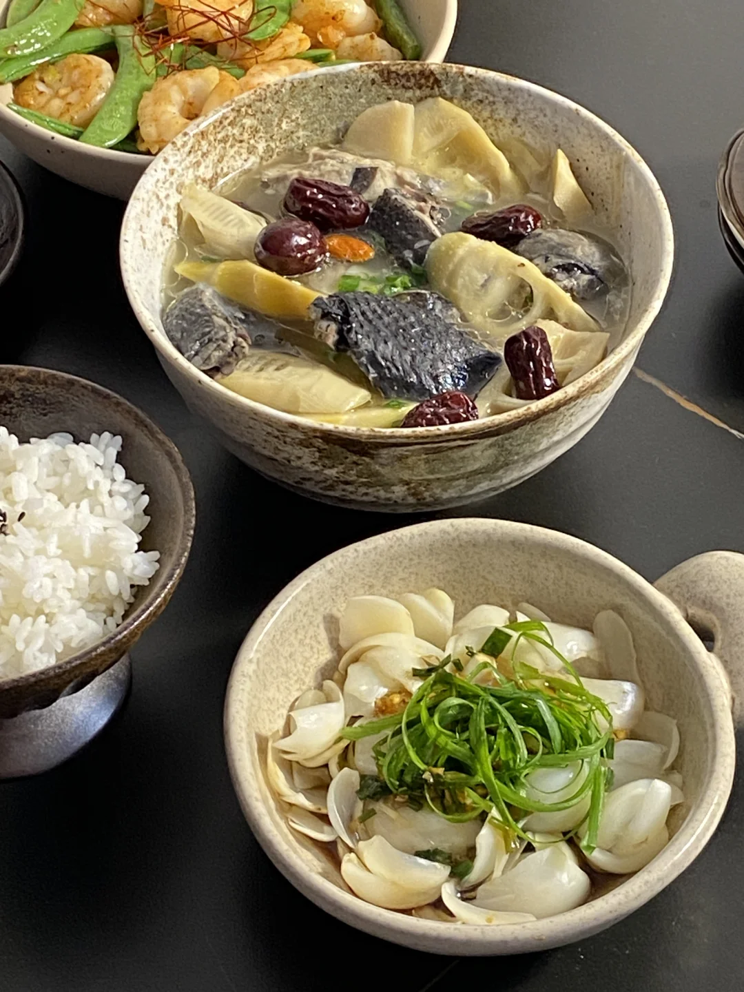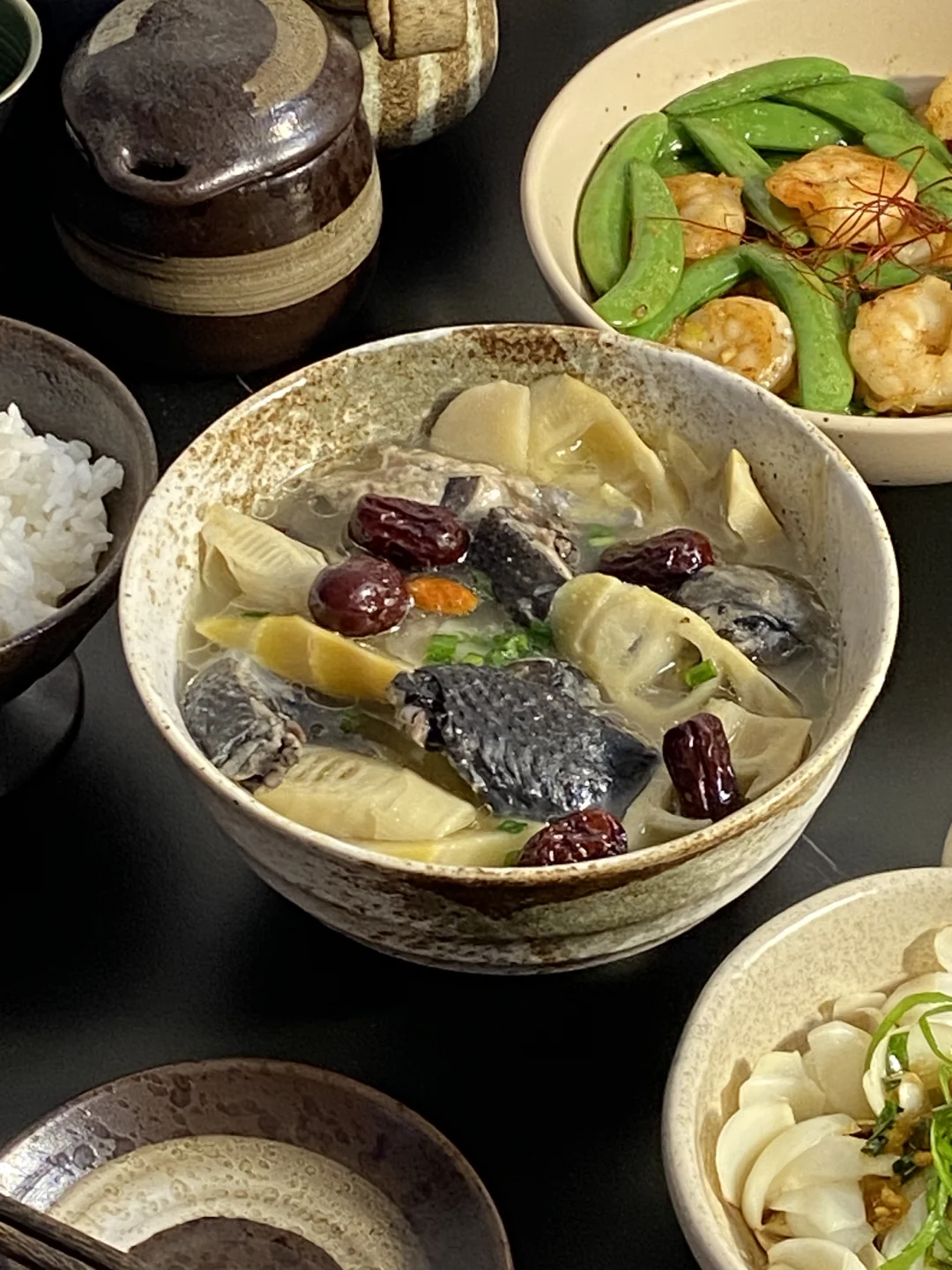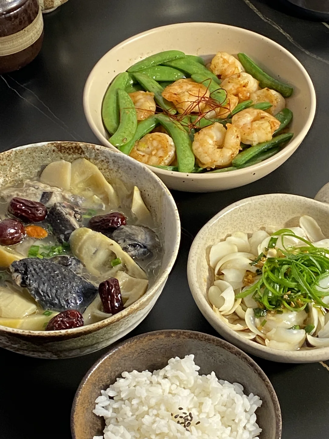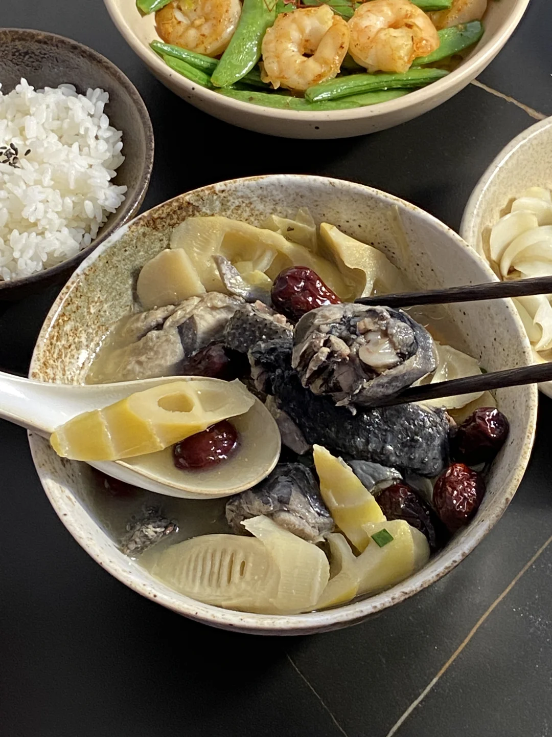 今日菜谱📜鲜笋乌鸡汤 葱油百合 虾仁甜豆🥢