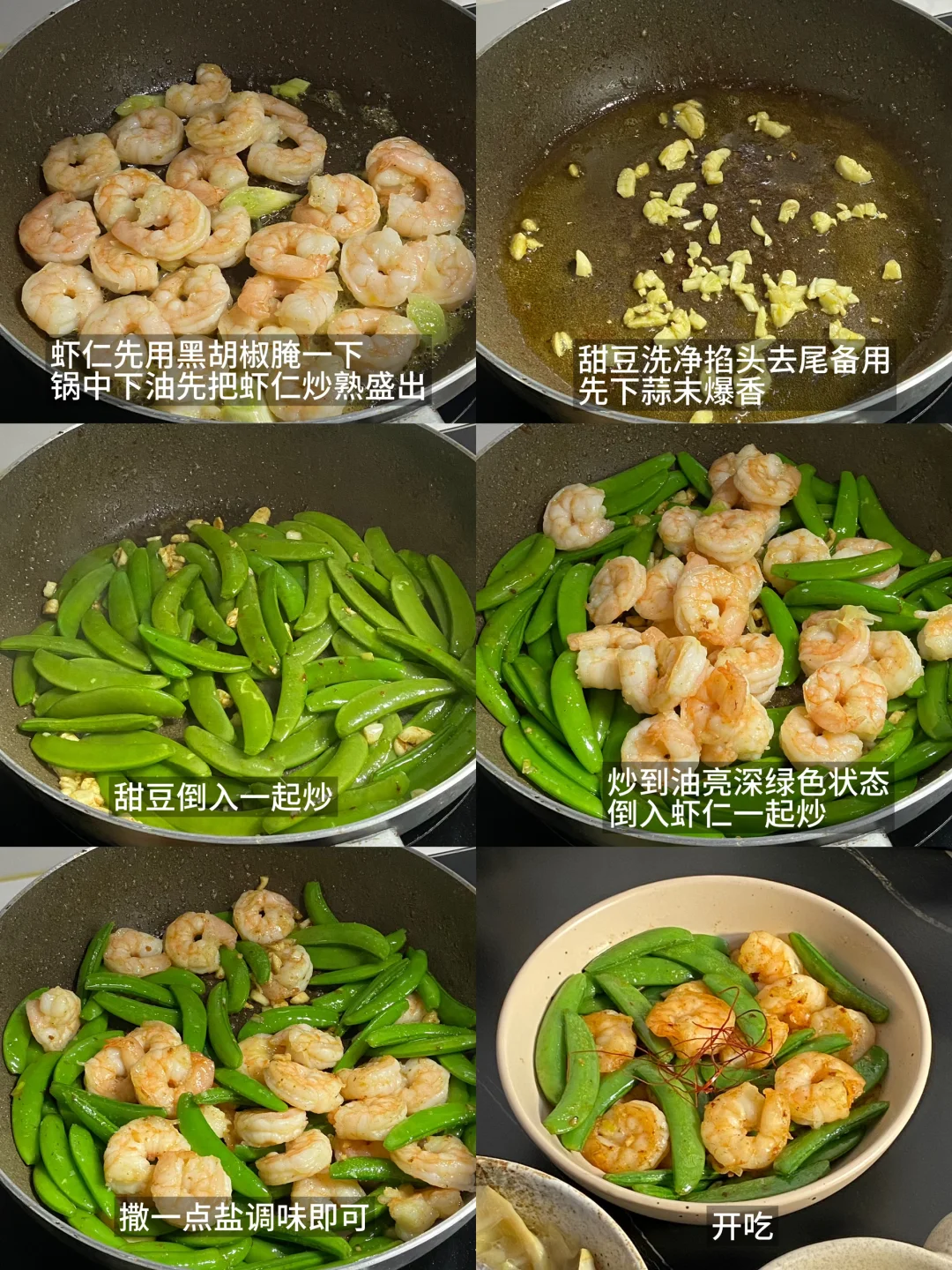 1)虾仁先用黑胡椒腌一下,甜豆掐头去尾,蒜切末