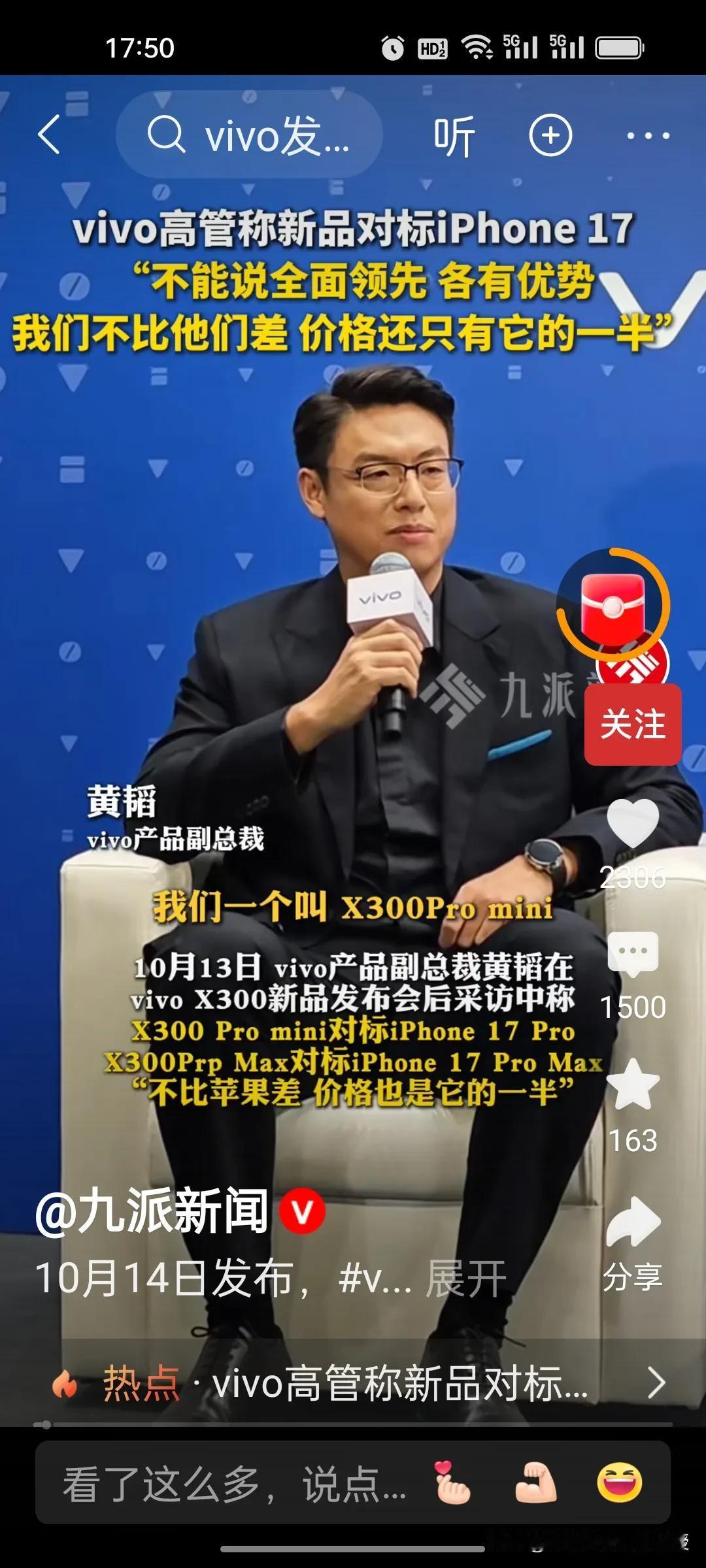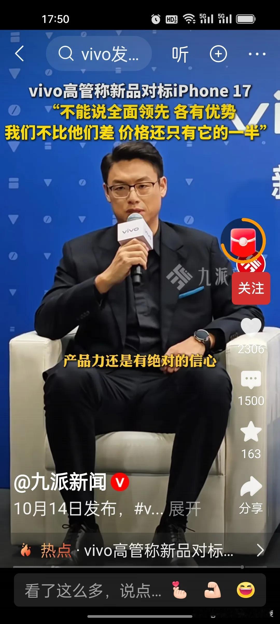 不但小米手机新品对标IPhone17,Vivo新品X300也对标IPhone17,其高管称,“我们不比他们差,各有各的优势,价格还只有它的一半”。 试用过家里的Vivo旧款拍照和其他手机拍的一起对比,明显Vivo手机拍出的效果更鲜亮,人物更柔和,景色更生动。 IDC数据显示,今年第二季度,vivo出货量为2710万台,市场份额为9.2%,同比增长4.8%,排名全球第四。 其实,Vivo的存在感远不及小米,华为,苹果,宣传力度也不如这些品牌,但是出货量仍然排在全球前列,仅次于小米,说明口碑不错。 很少有人知道vivo的创始人是沈炜,他是原来小霸王生产部的员工,后跟随段永平创业。2010年成立了Vivo。现在段永平身居幕后,沈炜也跟段永平的风格一样,比较低调,不像雷军一样喜欢演讲,不过,一切拿数据说话,Vivo确实是低调的实力派。