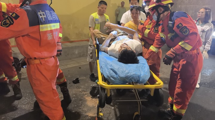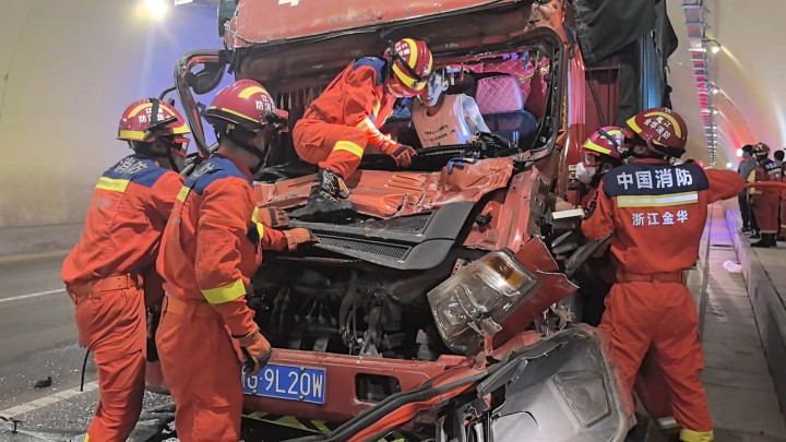 今天(14日)中午,在浙江金华武义竹岩山隧道内,发生一起三车连环追尾的交通事故,其中一辆红色货车车头严重变形,驾驶员右腿被卡,情况紧急。当地消防接警后迅速出动。