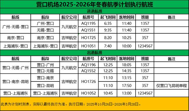 南京⇌营口班期由换季前的周二/四/六改为周三/五/日。