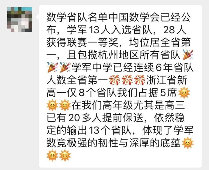 “数学省队名单中国数学会已经公布,学军13人入选省队,28人获得联赛一等奖,均位居全省第一,且包揽杭州地区所有省队。学军中学已经连续6年省队人数全省第一。浙江省新高一仅8个省队我们占据5席,在我们高年级尤其是高三已有20多人提前保送,依然稳定输出13个省队,体现了学军数竞极强的韧性与深厚的底蕴。”