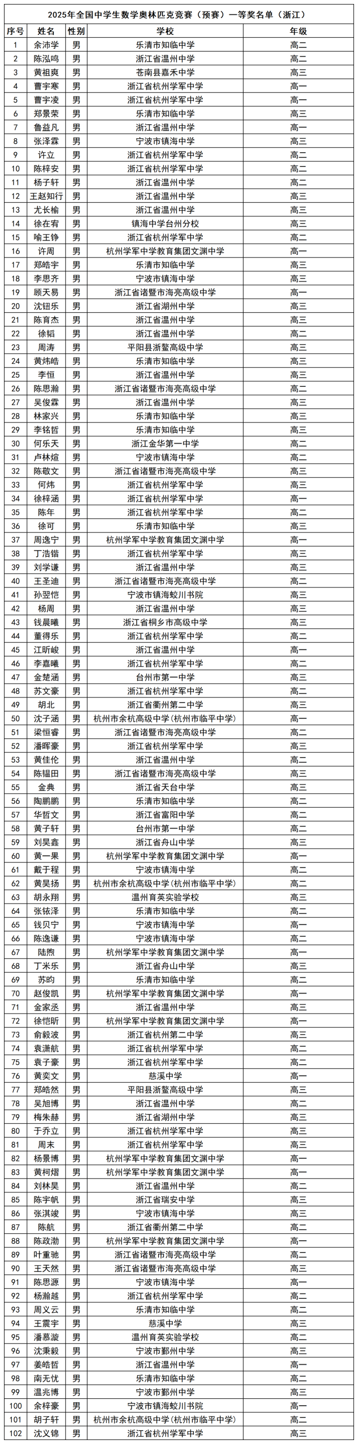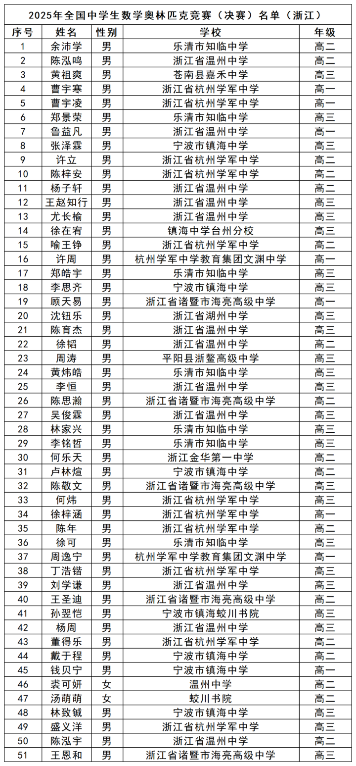 刚刚,2025年全国中学生数学奥林匹克竞赛决赛浙江省队和预赛一等奖名单发布。浙江省队共51人,分布在10余所高中学校。