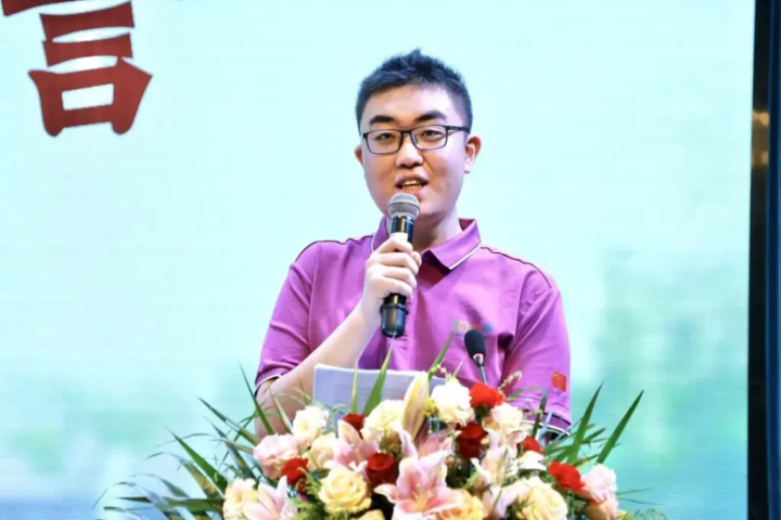 今年8月,邓乐言回到初中母校上海市民办华育中学在开学典礼上发言(图片来自学校官网)