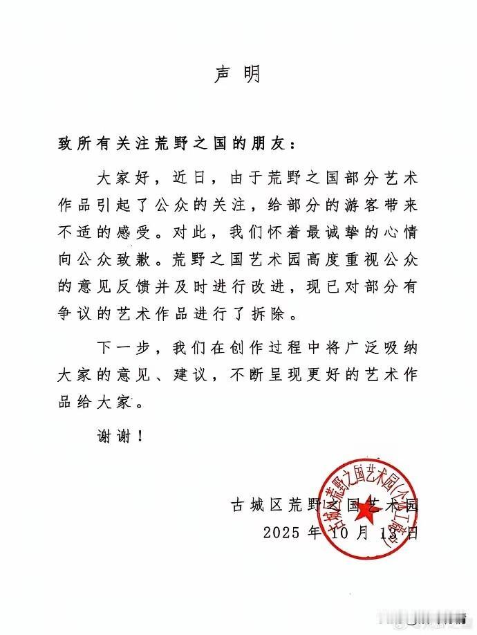 云南荒野之国人体蜈蚣事件后续来了, 景区发布了官方道歉声明, 声明中表示对部分引起游客不适应作品进行拆除,高度重视公众的意见反馈, 看来园区是妥协了, 之前还表示是有人故意将人体蜈蚣和三面女孩拍照调低了光线, 拍出了渗人的感觉, 实际上一点也不恐怖, 如今园区乖乖道歉, 看来是顶不住舆论压力了。 既然是收费的童话世界, 为什么会有这些如此诡异的作品, 这让小孩子看了肯定会做噩梦的, 虽说艺术创作不应该拘泥形式, 但你这作品怎么看都没有童真童趣, 反而让人想起了日本的一部电影叫做《咒乐园》,相信很多人看过, 确实相当恐怖, 这荒野之国不知道的以为是拍恐怖片的片场呢,儿童乐园要有儿童乐园的样子,如果晚上进入场地再加上昏暗的光线你就说你害怕不! 大家觉得风头过后丽江荒野之国后续还会有渗人的作品出现吗? 旅行的意义 丽江旅游 荒野之国 人体蜈蚣