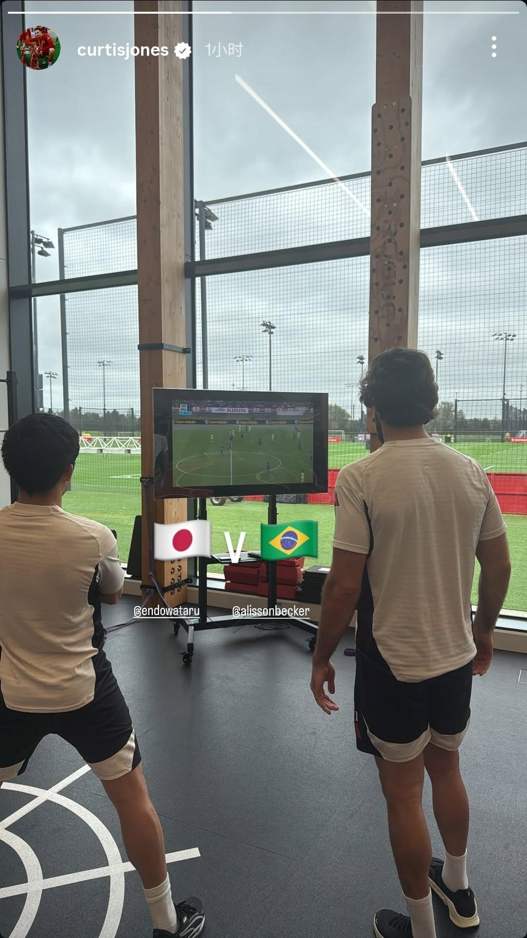 柯蒂斯-琼斯晒照:远藤航、阿利松在电视前观看日本击败巴西