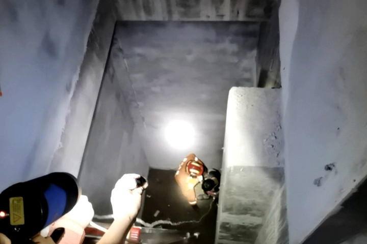 救援人员下到井底,近距离检查,发现男孩脸部红肿出血,左手左膝均有伤情,但万幸意识清醒,具备自主行动能力。随即为他绑好安全绳,在井上队员的配合下,引导男孩沿拉梯向上攀爬。