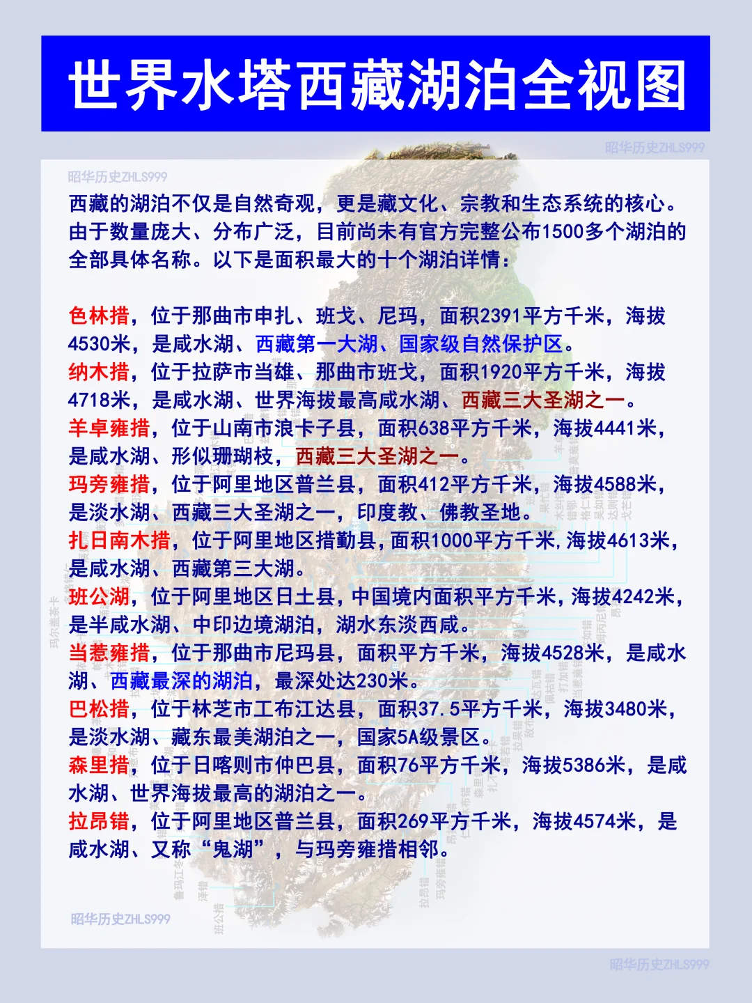西藏的湖泊不仅是自然奇观,更是藏文化、宗教和生态系统的核心。由于数量庞大、分布广泛,目前尚未有官方完整公布1500多个湖泊的全部具体名称。以下是面积最大的十个湖泊详情: