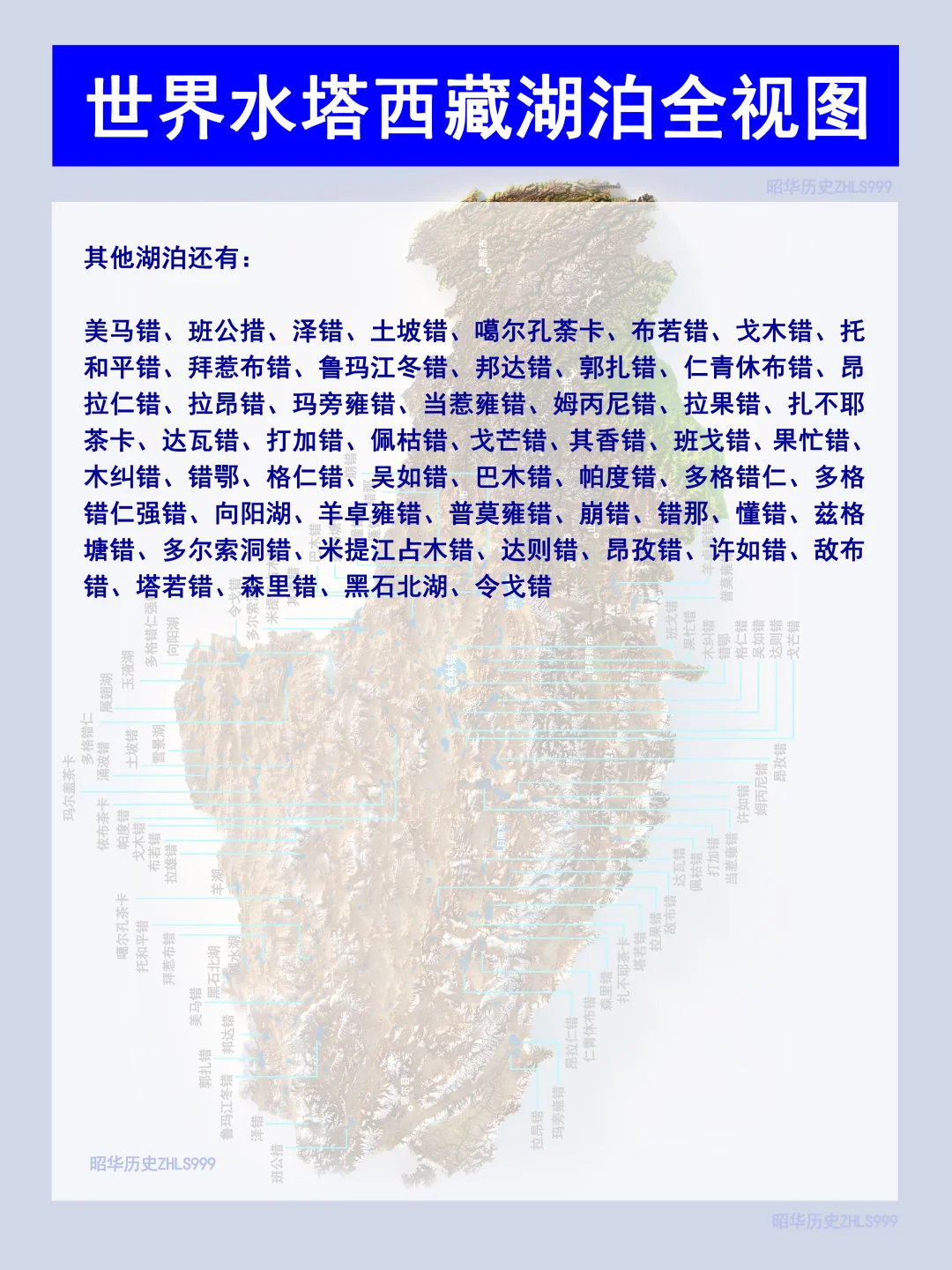 美马错、班公措、泽错、土坡错、噶尔孔荼卡、布若错、戈木错、托和平错、拜惹布错、鲁玛江冬错、邦达错、郭扎错、仁青休布错、昂拉仁错、拉昂错、玛旁雍错、当惹雍错、姆丙尼错、拉果错、扎不耶茶卡、达瓦错、打加错、佩枯错、戈芒错、其香错、班戈错、果忙错、木纠错、错鄂、格仁错、吴如错、巴木错、帕度错、多格错仁、多格错仁强错、向阳湖、羊卓雍错、普莫雍错、崩错、错那、懂错、兹格塘错、多尔索洞错、米提江占木错、达则错、昂孜错、许如错、敌布错、塔若错、森里错、黑石北湖、令戈错