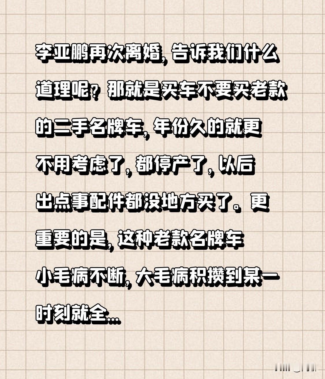 李亚鹏再次离婚,告诉我们什么道理呢? 那就是买车不要买老款的二手名牌车,年份久的就更不用考虑了,都停产了,以后出点事配件都没地方买了。 更重要的是,这种老款名牌车小毛病不断,大毛病积攒到某一时刻就全线罢工! 当然,买老款也有一个好处,那就是面子上有光。 现实中有些买车的人,想要面子但钱不够于是考虑最便宜的老款车,管他几手,先开了再说! 兜风的时候是嗨的,隔段时间去维修的时候就心痛了! “我和你需要勇气……” 就算梁静茹亲子给你唱勇气,我也强烈不建议!