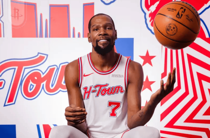火箭球员凯文-杜兰特半场9投4中,三分3中0,得到10分3篮板2助攻1盖帽。