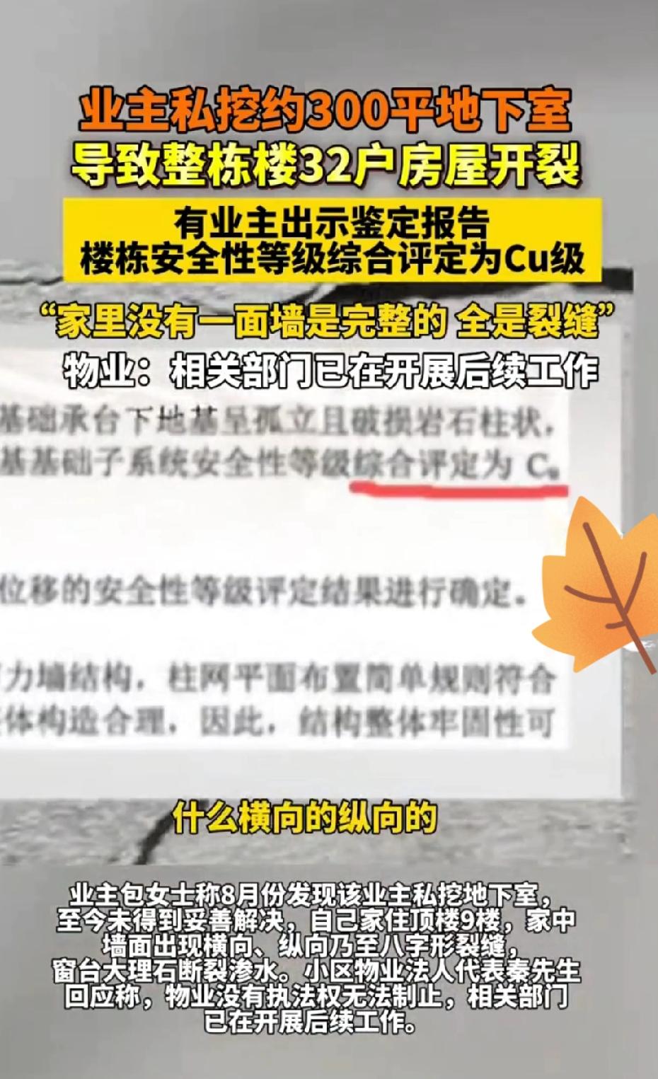安徽六安这事儿太吓人了!有业主偷偷挖了300平地下室,直接把整栋楼搞出了大问题,32户人家的房子全裂了。 顶楼业主家更惨,墙面横缝、竖缝、八字缝到处都是,窗台大理石都断了,渗水渗得没法住。这人太缺德,白天挖晚上偷运土,还用围栏挡着锁上门,就是怕人发现。 最气人的是物业,一句“没执法权”就推干净了。可这事儿哪是没权管?早该盯着制止,不是光上报就完事。之前上海类似的事,当事人都被判了刑,这事儿可不能只给10天安置费就了结。 说到底,这是拿整栋楼的人命当儿戏!你们觉得,除了赔钱修复,该怎么追责才解气?