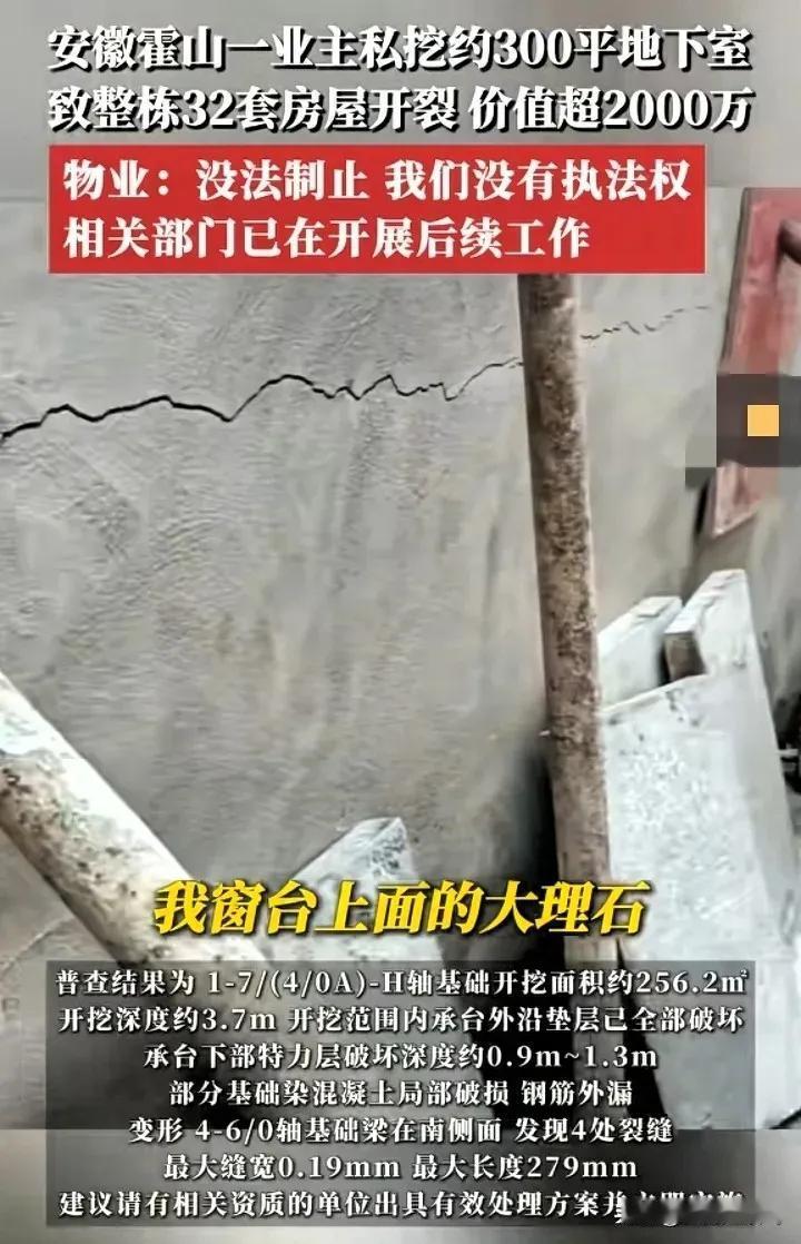 天没塌,但安徽霍山这栋楼是真裂了!2000万价值的房子、32户业主的家,全被一个自私邻居坑惨了,这哪是遇着“猪队友”,简直是碰着又坏又蠢的“定时炸弹”! 景秀蓝湾的黄某 太离谱了,买了一楼就想占便宜,围着3米高遮挡物,白天挖晚上运土,2个月挖出4.3米深、300平的地下室,直接挖到地基承台!楼栋外墙裂了、顶楼渗水、邻居家大理石窗台都断了,他还不当回事接着装,真是无知者无畏。 现在32户业主维权无门,找黄某 他没钱,找物业说没执法权。最气的是“人在家中坐,祸从邻居来”,好好的家变成Cu级危房。这事根本不是“倒霉”,是自私者无视规则的代价。