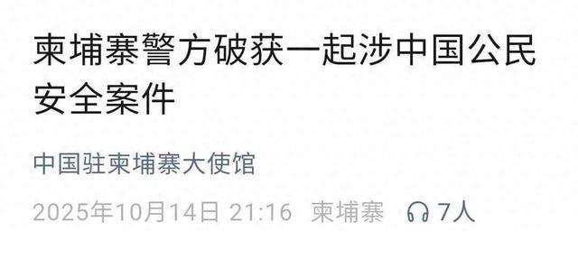 当地时间10月14日,中国驻柬埔寨大使馆发布公告称,据柬埔寨西哈努克省警察局发布的消息,柬警方近日破获一起涉中国公民安全案件并抓获相关嫌疑人。
