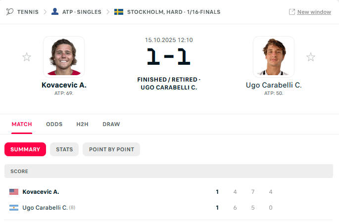 记者JoseMorgado(网球)报道,卡拉贝利在第三盘0-4落后时对阵科瓦切维奇退赛。本周斯德哥尔摩站种子选手战绩来到0胜4负。2号种子鲁德和3号种子沙波瓦洛夫将于今日出战。