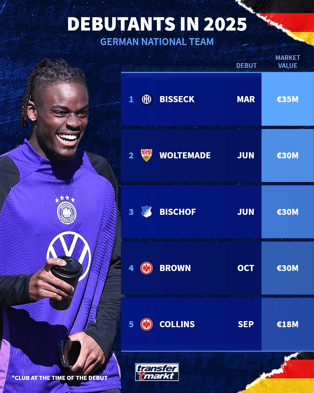 虎扑10月15日讯2025年,世界足坛迎来新一批冉冉升起的国家队新星。根据Transfermarkt数据,德国国家队这一年共有5名球员完成成年国家队首秀,其中身价最高的是比塞克,他在3月完成首秀,身价高达3500万欧元。紧随其后的是斯图加特锋线新星沃尔特马德与霍芬海姆的中场指挥官比朔夫,两人身价均达到3000万欧元。