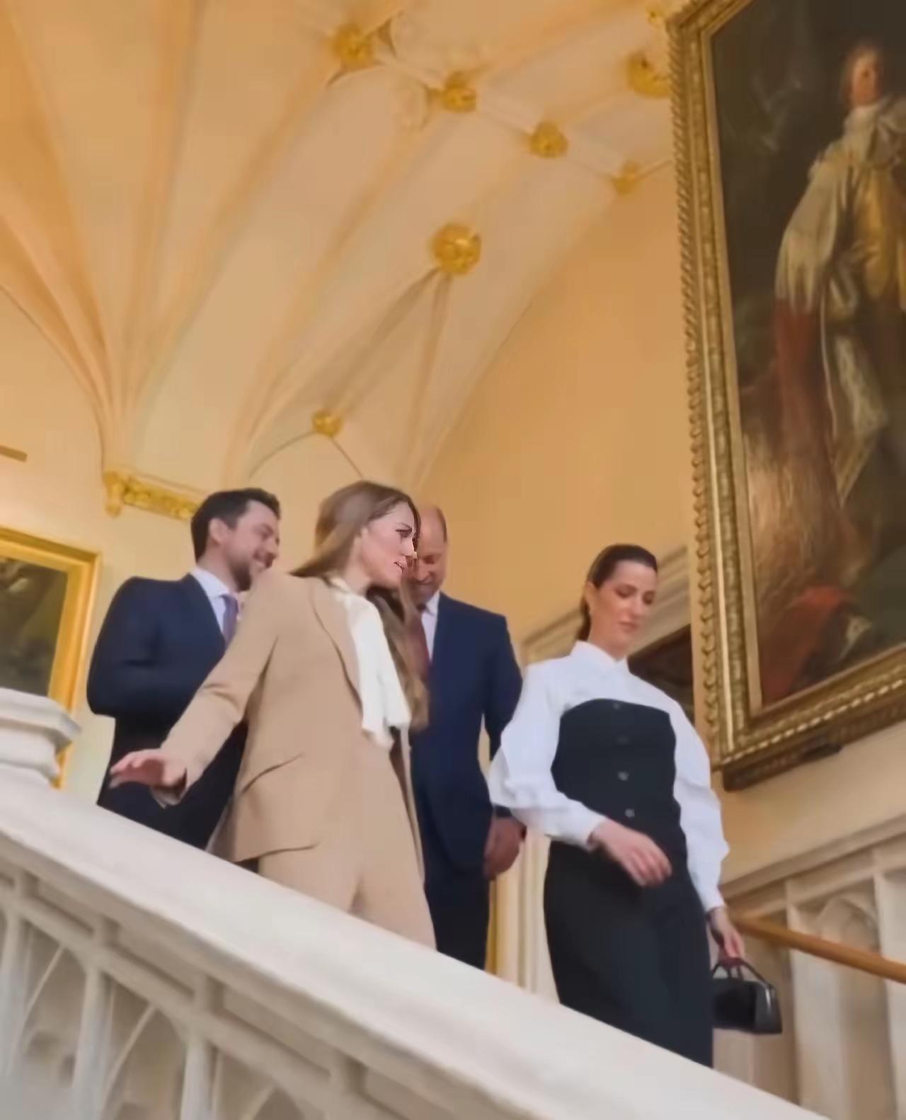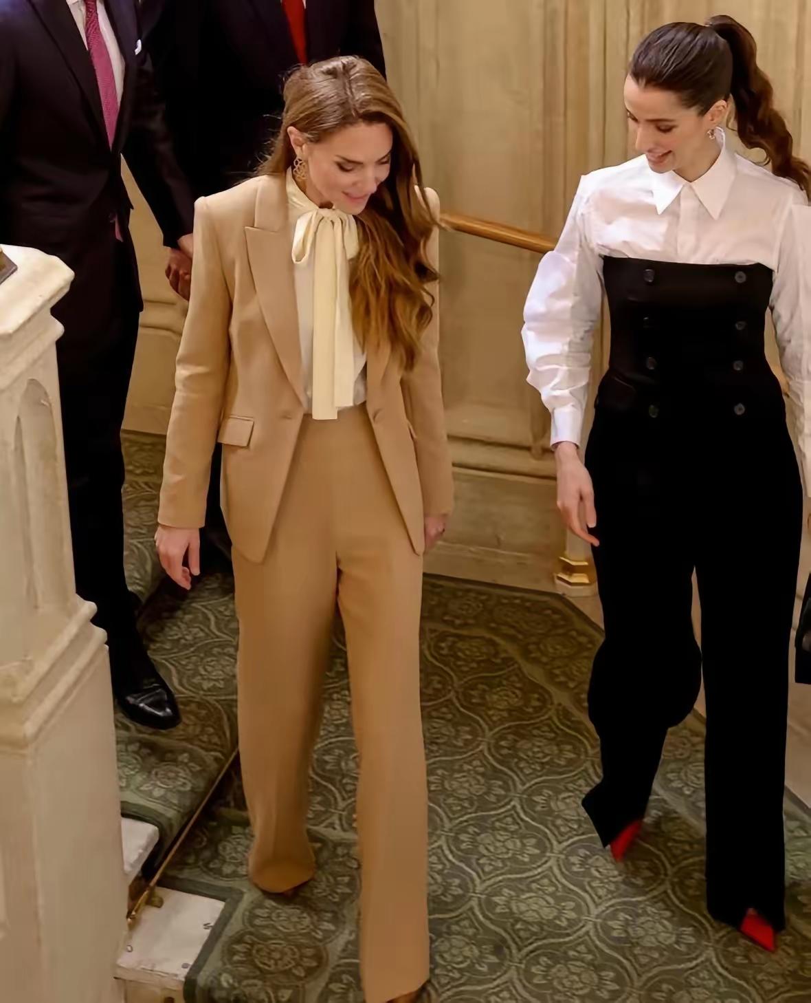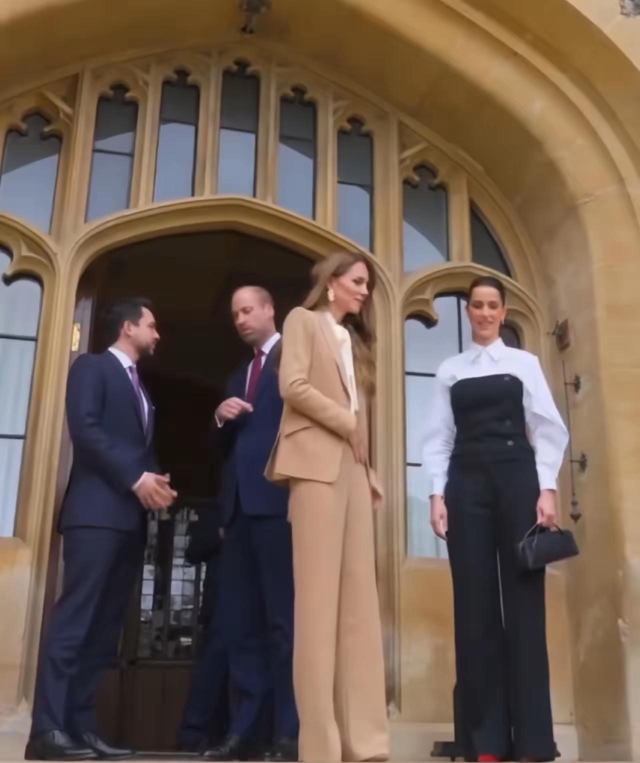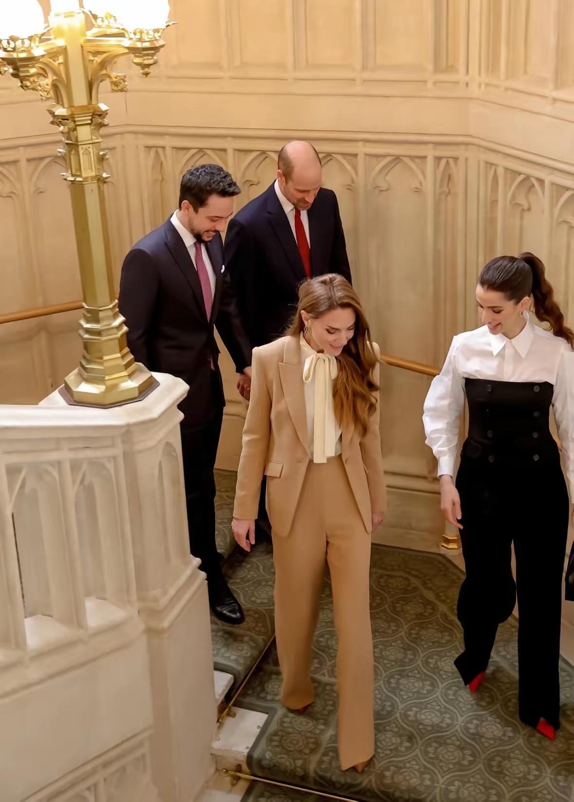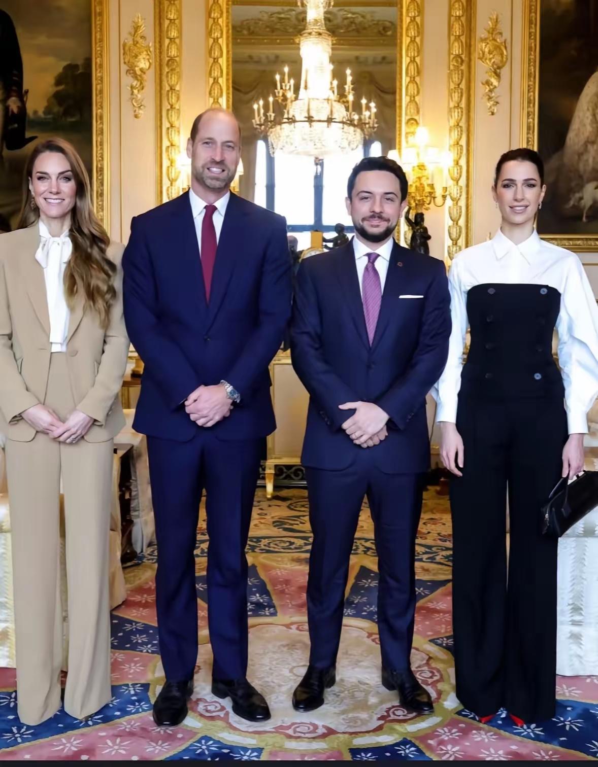 当地时间10月15日,威廉王子与凯特王菲接待约旦侯赛夫妇,四人颜值爆棚,身材板正,衣品时尚大气! 当天凯特王妃一袭卡其色衣服套装亮相,内搭白色衬衣,干练利落又不失优雅,衬衣领采用飘带设计,衬得她温柔可亲,韵味十足! 而侯赛因王的夫人,拉杰瓦气质也不输凯特王妃。她身穿黑白拼接套装,梳着高马尾,脚踩红色高跟鞋,身材高挑,气质过人,和凯特王妃站在一起犹如姐妹,这颜值和身材不输一线明星! 威廉与侯赛同穿蓝色西服,二人也是身材板正,帅气有型,这四人同框画面,真是是好养眼啊!