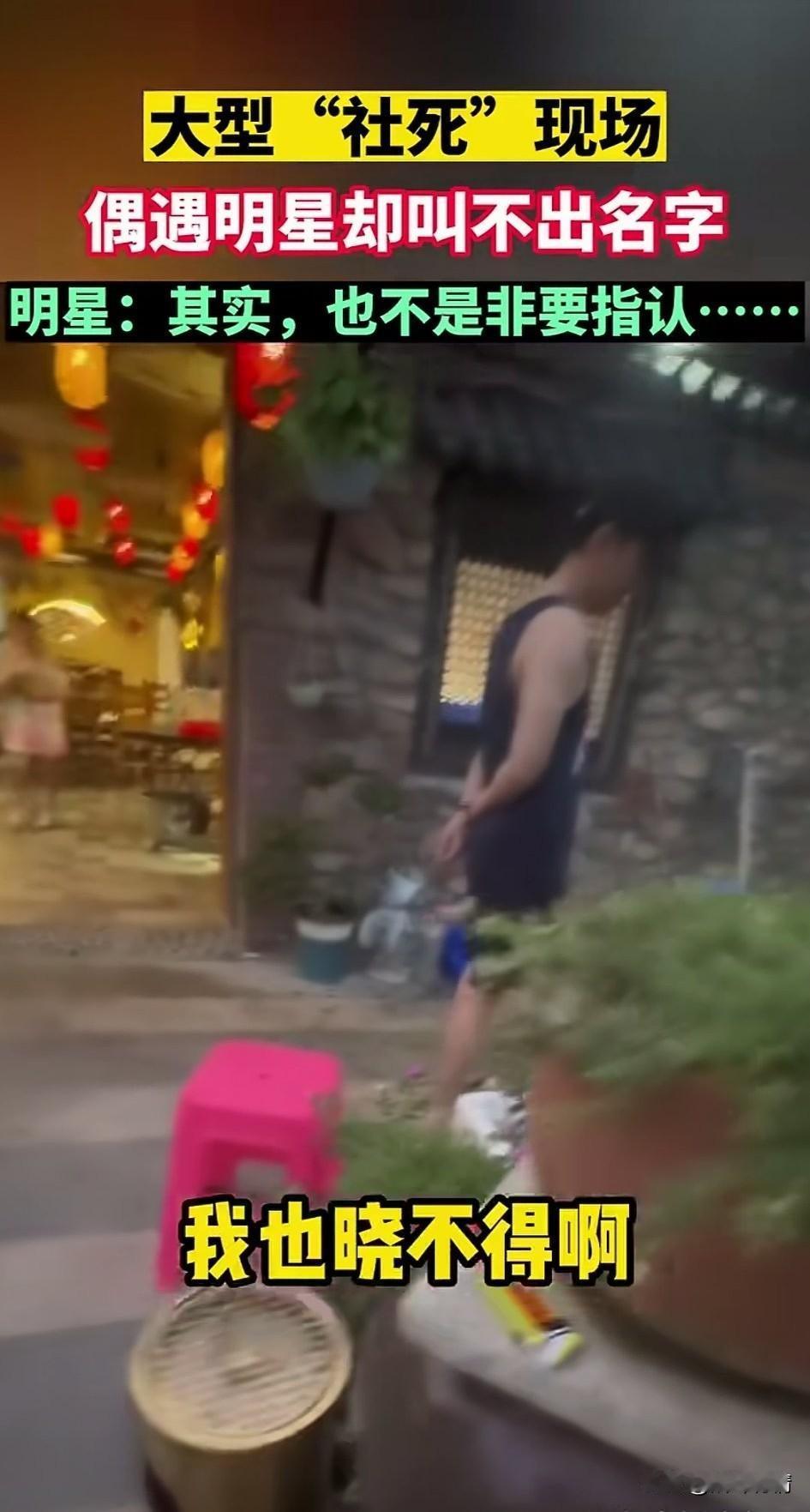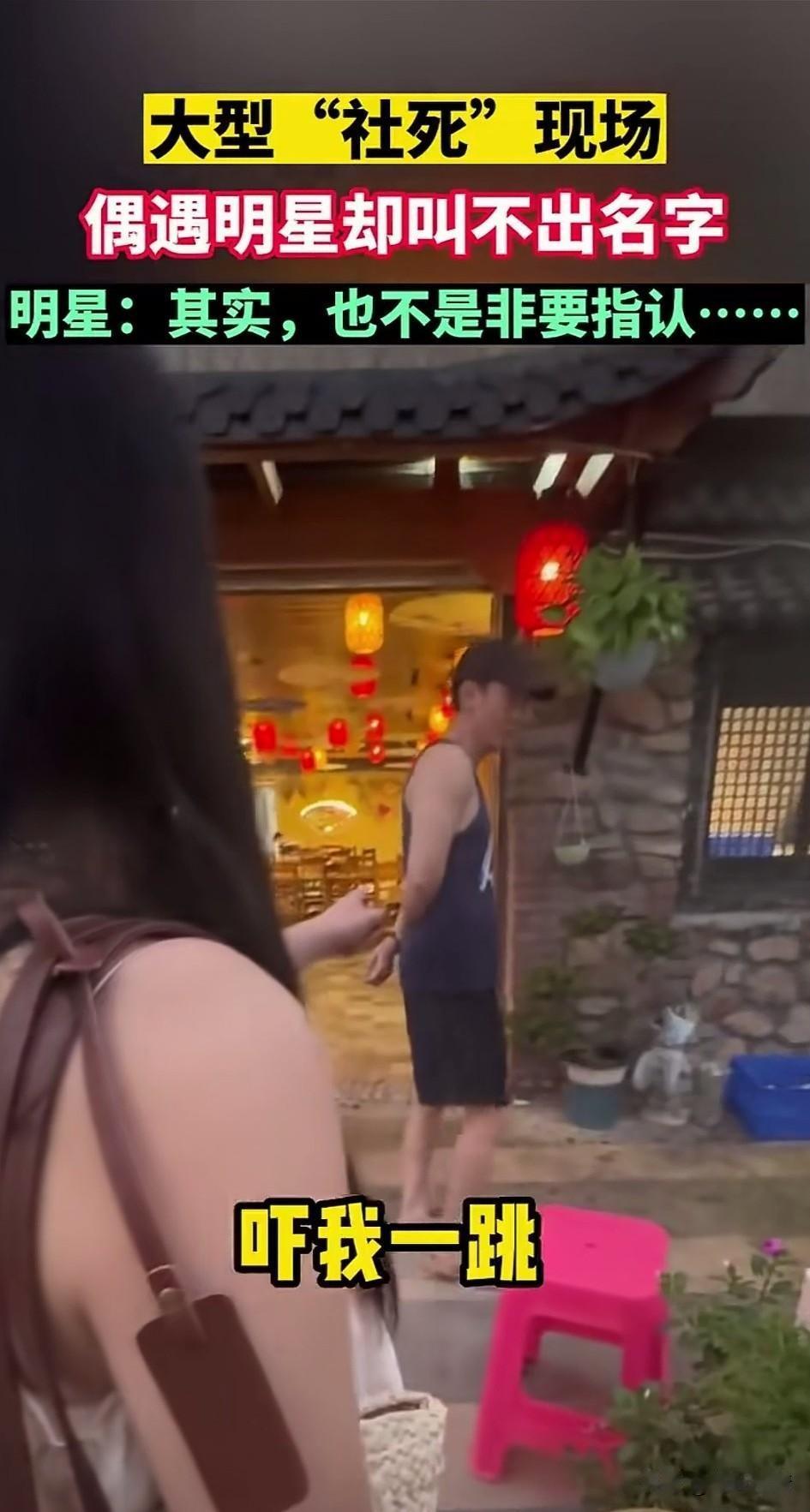 女子出门旅游, 在一处古镇偶遇明星, 激动大叫明星,明星快看, 带鸭舌帽穿黑背心男子说你吓我一跳, 女子也不尴尬反问你是明星, 男子抬头看了他一眼满是期待, 结果女子憋了半天想不起来对方叫啥? 男子只好说不是了,别乱说, 随后晃晃悠悠走了, 这真是大型社死现场, 鸭舌帽男子肯定在想, 看来我还是不出名, 叫不出来就不要叫了, 其实也不是非要指认, 后来眼尖的网友认出是韩栋, 后来韩栋在节目中说出这次经历表示, 这明星也不是非认不可! 大家觉得明星韩栋出名吗? 娱乐圈那点儿事 街头偶遇明星 户外偶遇明星 遛弯偶遇明星