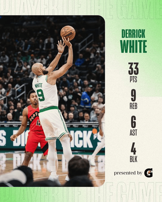 全场比赛,凯尔特人后卫德里克-怀特首发出战35分钟,23投10中,三分球17投6中,罚球9罚7中得到33分9篮板6助攻4封盖。