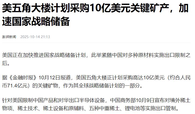 美国战争部宣布,开始囤物资了!   当地时间10月14日,美国战争部被披露出一则消息,其正打算花10亿美元紧急采购钴、锑、钪这些关键矿物,目的是赶紧把国家的战略储备库填满。   这些矿物可不是普通石头,每一个用处都不小!   钴是电动车电池、手机电池的核心材料,现在新能源车普及,钴的需求量直线上升;锑是制造芯片和军工产品的重要原料,没它很多高科技设备都造不出来;钪更是稀罕物,加到航空航天材料里能大幅提升强度。   美国现在是想靠囤这些东西,来保住高端制造业和国防供应链的安全。可问题在于,就算把这些战略资源堆得像山一样高,美国现在也没法把它们变成实实在在的产品竞争力。   美国商务部2024年的制造业报告里写得很清楚,制造业占整个国家GDP的比例已经降到8.7%,很多基础加工工厂都搬到国外去了,结果就造成“有资源却没本事加工”的尴尬局面。   拿钴来说,全球90%以上的精炼产能都在亚洲,美国本土只能把钴矿挖出来,想要提纯成能用的材料,还得运到亚洲的工厂去加工,加工完再运回美国做成电池或其他产品。   这一来一回,不仅耽误时间,还得额外花运费。更重要的是,供应链安全根本没保障,中间哪个环节出点问题,整个生产就可能卡住。   更核心的问题是,美国想靠囤物资在和其他国家的竞争中抢优势,却没意识到产业空心化已经带来了连锁反应。   从五角大楼的采购计划能看出来,锑的采购量占了全球年产能的15%,钪更是占到20%,这么大规模地扫货,已经让这些矿物的国际市场价格开始上涨。   可就算把这些矿物都拉回美国,国内的制造企业也消化不了——美国半导体行业协会的数据显示,本土芯片制造需要的特种材料,70%都得从国外进口。   这不是缺资源,而是缺把资源变成成品的整条产业链,没有足够的精炼厂、加工厂,也没有配套的技术工人,就算有再多原材料,也只能放在仓库里当摆设。   而这种“囤着不用”的操作,说到底就是竞争压力下的慌不择路。   最近几年,全球对关键矿物的需求越来越大,各国都在忙着建自己的储备库,美国仗着有钱就想先把资源抢到手,却忘了产业竞争力的关键是完整的产业链条。   这就像盖房子,只买了钢筋水泥,却没有施工队和设计师,再好的材料也只能堆在工地上,盖不出房子来。美国能源部的评估报告也承认,如果未来5年不能把基础加工产能重新建起来,就算储备再多关键矿物,也改变不了高端制造业依赖海外供应链的现状。   这场看起来声势浩大的囤货行动,其实只是给自个儿找了点心理安慰,解决不了工业根基薄弱的真正问题,最后很可能是花了大价钱,却没买到实实在在的竞争力。