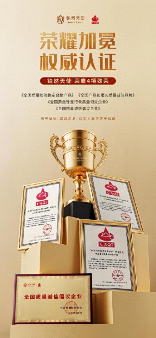 近日,在2025年全国“质量月”活动中,辽宁铂然天使珠宝有限公司凭借其卓越的产品质量与诚信服务体系,成功荣获中国质量检验协会(CAQI)颁发的四项重要荣誉,包括“全国质量检验稳定合格产品”“全国产品和服务质量诚信品牌”“全国质量诚信倡议企业”及“全国黄金珠宝行业质量领先企业”。