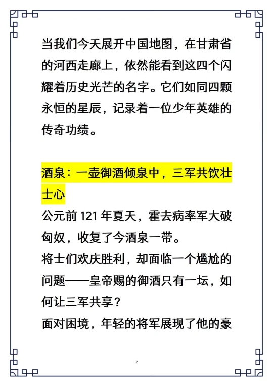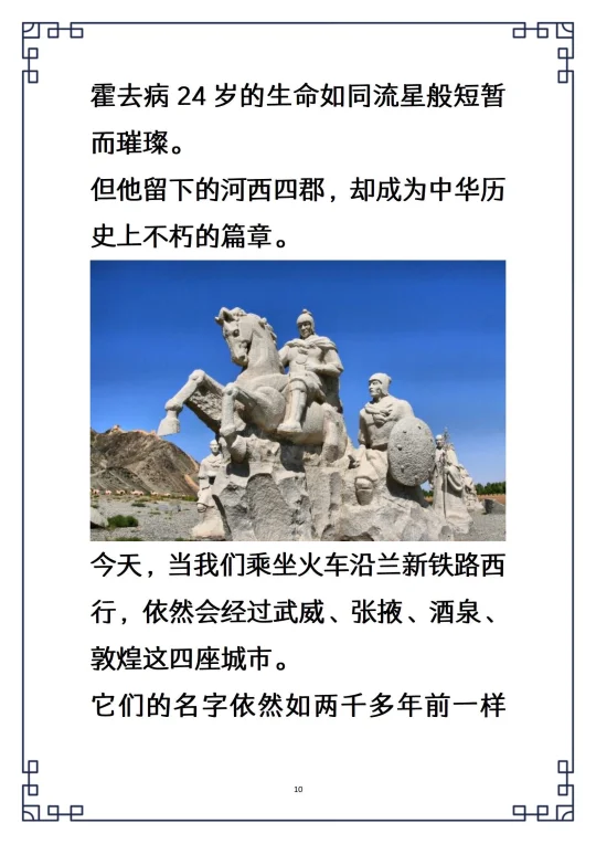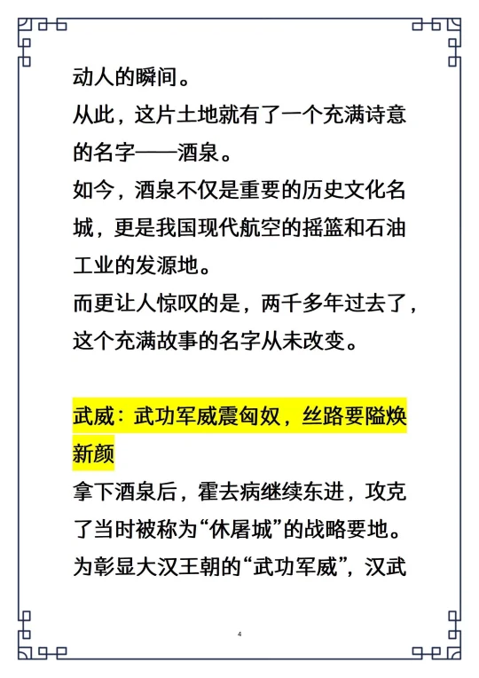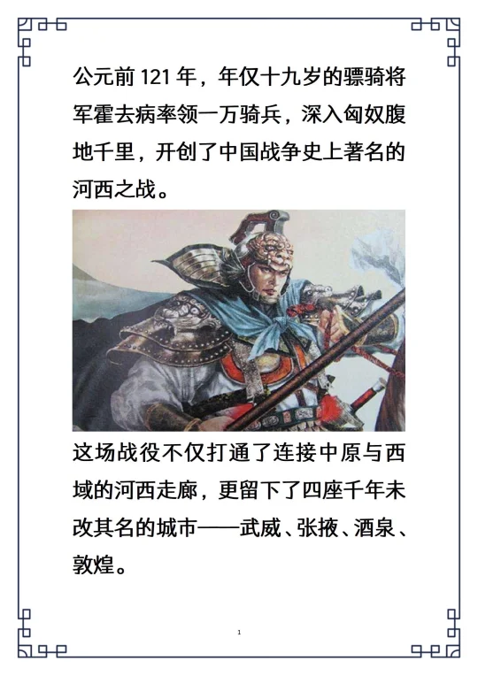 记录吧就现在 [吧唧R]在汉武帝时期,北方游牧民频繁侵扰中原,令当地百姓苦不堪言。 [派对R]为了保卫百姓和领土完整,汉朝将士们勇猛奋战,打的匈奴节节败退,其中最为英勇的便是冠军侯霍去病。 [大笑R]特别是在河西之战期间,霍去病一连攻下四座城池,并且取了4个霸气的名字,一直沿用至今,两千多年来未曾改变。