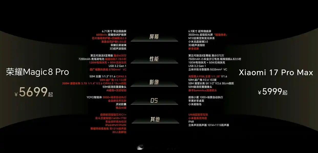 再看荣耀,那就更直接了,在荣耀Magic8系列发布会上,花了老大篇幅,把自己的手机和小米17系列从头到尾比了个遍。