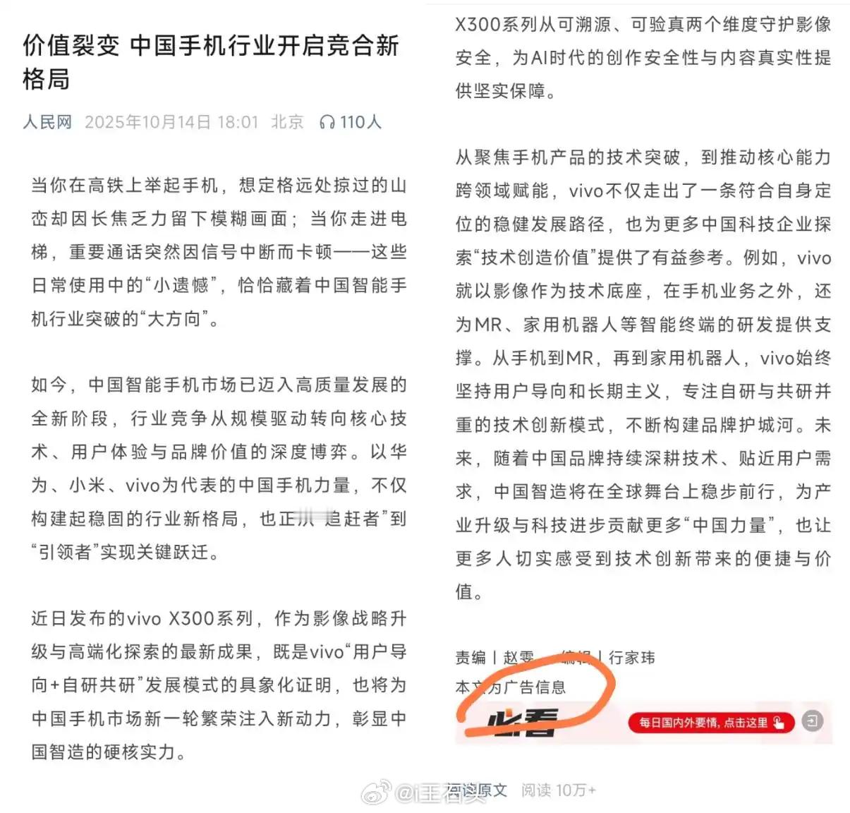 vivo,发布X300系列之后,它们在人民网上投了个广告,很有意思。