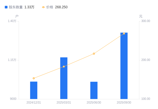 日期A股户数(户)流通A股户均持股数(股)户均持股市值(万元)2025-09-301326411503.14308.572025-06-301010915093.25326.772025-03-311167313070.99239.572024-12-311011814966.58229.322024-09-30865417498.48280.032024-06-30911516613.48230.082024-03-31956415731.30179.292023-12-311243812096.33116.502023-09-30694521663.67290.882023-06-30612324571.97383.25