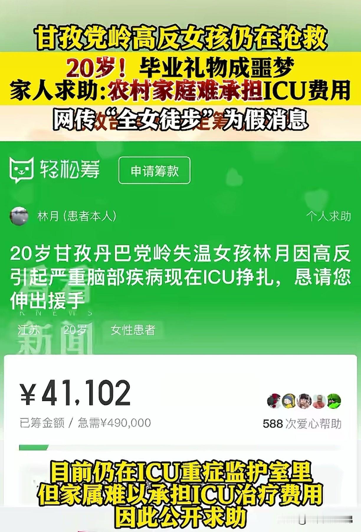 你徒步玩乐,出事了网友买单?徒步失温女孩才被救,ICU住了2天,父母在网上公开众筹,多数网友不买账。有网友说,自己家里人出事的时候,都是先卖车卖房,能借的借,能凑的凑,实在没办法了才去众筹,他这是才2天就开始众筹,家里一点积蓄都没有吗? 据说女孩是农村家庭,供孩子读完书,手里没有什么积蓄的农村家庭不在少数。而且女孩刚卫校毕业,估计也没有啥积蓄,ICU一天要烧好多钱啊,她这又是水肿,又是脑疝的,各种并发症都来了。 更有人说,我在苦逼加班的时候,你在徒步玩乐,出了事让我众筹? 其实捐不捐款都是个人意愿,如果你觉得心疼一个20岁的姑娘,以后还有美好人生,手头刚好有富余,愿意捐就捐点,就当积德行善了,不愿意捐也没事。 甘孜党龄的蓝天白云确实好看,谁不想去看看,只是我们都迫于各种现实困扰,无法实现。一个20岁,困于校园十几年的姑娘,想去看看外面的世界,能理解,但是一定要在自己的能力范围内。不是什么东西都可以随便尝试的,弄不好失了健康,甚至是生命! 登山之前先衡量一下,自己有没有经验,准备够不够充分,身边有没有有经验的人陪伴,遇到突发状况该如何应对。 人还是要敬畏自然,珍爱生命,量力而行,觉察身体有不适,立刻返程。徒步真的不是想象的那么容易,一瓶矿水,一个手机,一个充电宝就可以的! 徒步坠崖 徒步失踪 徒步失踪 爬山失温 女孩获救 女生徒步 徒步女子 深山获救