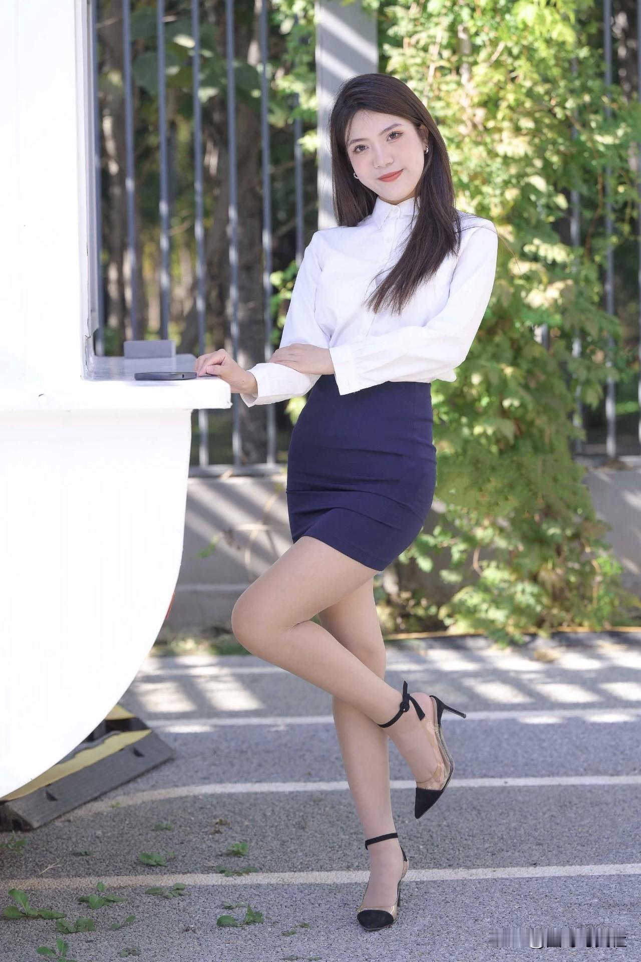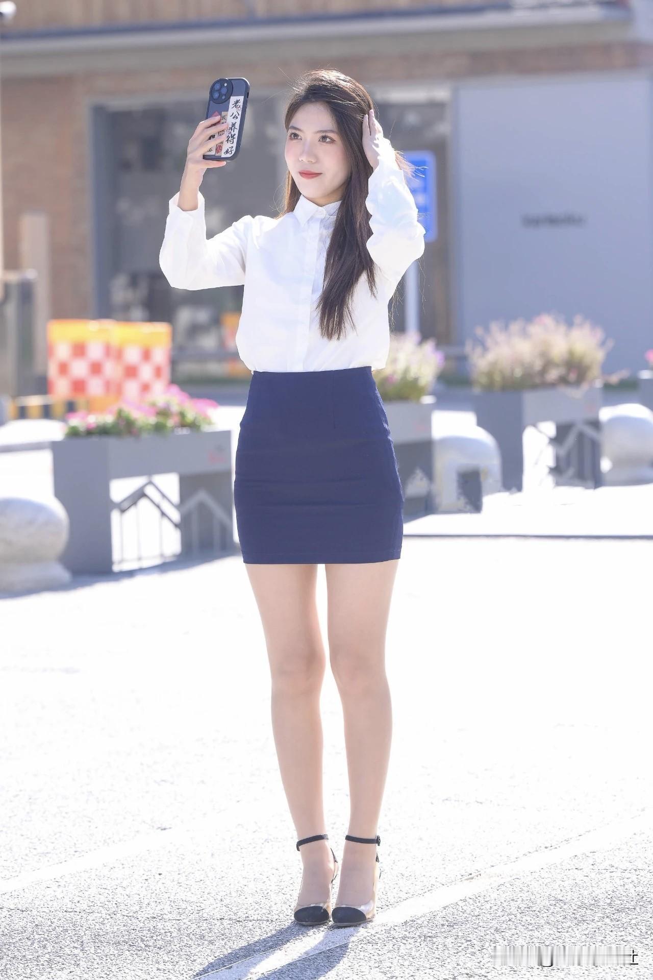 优雅白色衬衫搭配深蓝短裙,尽显都市时尚女孩风采如何将半身裙穿出时尚感和女人味