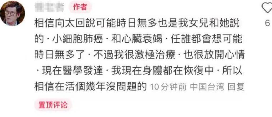 刚确诊小细胞肺癌、还带着心脏衰竭的郭碧婷爸爸,放着治病的事儿不着急,反倒一口气发了5条动态帮亲家向太说话! 更让人没想到的是,之前向太一句“最后的日子”,直接让他被传成病危,连吊唁的说法都冒出来了。 他当时气得发文怼过谣言,结果转头就公开自己患癌的隐情,还反复说跟向太没关系,这又是晒挂号单又是兜底的,到底图啥?   说实话,最近娱乐圈这事儿看得人真是五味杂陈,主角不是啥流量明星,而是郭碧婷的爸爸。 就在10月16号,郭爸爸在自己社交账号上晒了张医院的预约单,上面写着是癌症中心的胸腔内科,配文更是让人揪心又好奇:“抽烟50年的后果,必须说的更清楚些好还人清白。”   这张单子一出来,评论区立马炸了锅,大家都猜这是身体出了大问题。 果不其然,郭爸爸在跟网友互动的时候直接说了实话,自己不光得了小细胞肺癌,心脏还衰竭了。 按说这病确实够严重的,任谁听了都得替他捏把汗,可他晒单子的核心却不是诉苦,而是要给一个人“还清白”,这人不是别人,正是他的亲家母向太。   要想说清这事儿,还得倒回去看看之前发生了啥。 前些日子向太在自己的短视频里提了郭碧婷,说她带着两个孩子一直在台北住,没回香港是因为娘家爸爸病了,得留在身边照顾。 向太还特意强调,郭碧婷爸爸的治疗费用全是女儿自己赚钱承担的,没花家里别的钱。   本来这话听着是夸郭碧婷孝顺懂事,可坏就坏在向太加了一句“可能是最后的日子”。 就这一句话,直接让网友炸了锅,没多久“郭碧婷爸爸病危”的词条就冲上了热搜,各种猜测满天飞。   郭爸爸看到这些消息的时候气得够呛,当即就发了条动态怼人:“都被传病危了,请大家有空来吊唁一下。 ”这话里的火气谁都能听出来,当时不少人都觉得,这明显是在内涵亲家母向太说话没分寸。   可让人没想到的是,没过多久郭爸爸又主动澄清了,说自己那话是冲传谣言的营销号去的,跟向太一点关系都没有。 他还跟大家交了底,自己的心脏衰竭确实挺危险的,但女儿郭碧婷特别孝顺,自从他生病后,总抽时间带他出去散心游玩,这点让他特别欣慰。   为了帮向太圆场,郭爸爸连着发了五条动态,到最后甚至把自己患肺癌这么隐私的病情都公开了,就是想让大家别再瞎猜。 可网友们根本不买账,评论里还是一片质疑声。   有人说,向太就算不是故意的,用“最后的日子”说亲家也太不妥当了,听着跟诅咒似的。 还有人觉得,向太这就是故意拿亲家的病情说事儿,无非是想博眼球赚流量。 更有甚者,直接联想到郭碧婷在向家是不是没话语权,所以向太才敢这么随便说她娘家的事。   面对这些猜测,郭爸爸是真无奈了,只能反问大家:“你们就一定要这样想吗?”其实明眼人都能看出来,郭爸爸这么拼命维护向太,说白了就是心疼女儿。 郭碧婷夹在老公家和亲家之间,本来就容易为难,要是真因为这点事闹得两家不愉快,最难受的还是她。 做父亲的,无非是想帮女儿挡掉这些是非。   不过好在郭爸爸自己的心态倒是挺乐观的。 他说了,现在医学这么发达,家里也有条件治病,自己只要好好配合治疗,放宽心,多活几年根本不是问题。   从另一个角度看,郭爸爸这事儿也给大家提了个醒,抽烟的危害是真不小,五十年烟龄最后落得这样的病,实在让人惋惜。   至于向太和网友之间的争议,或许就像郭爸爸说的,大家真没必要往坏了想。毕竟家家都有本难念的经,尤其是这种明星家庭,一点小事就容易被放大。咱们外人看看热闹就好,还是多祝福郭爸爸能早日康复,安安稳稳享享清福吧。