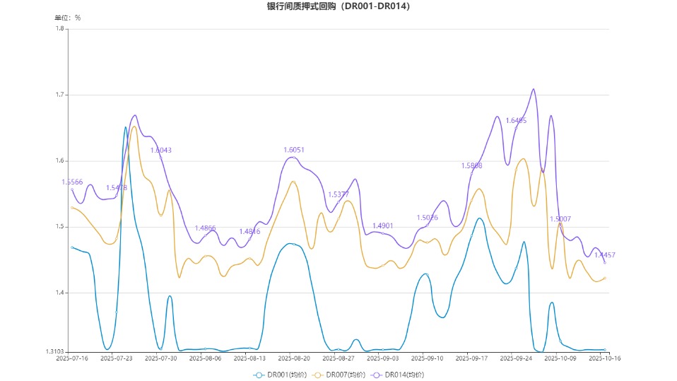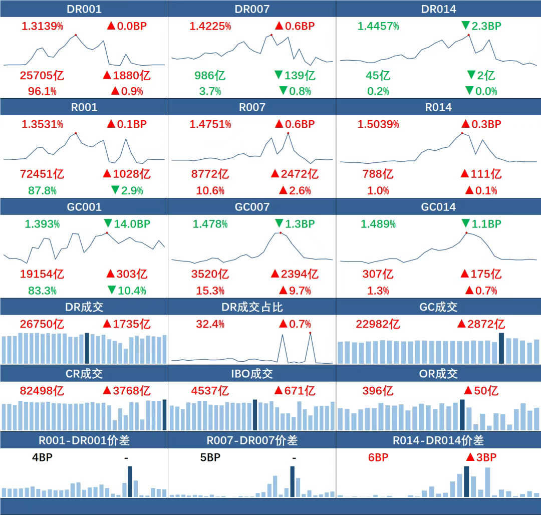 银行间质押式回购市场方面,多数品种小幅上涨,R007成交占比升至10.6%。具体看,DR001、R001加权平均利率上行0.0BP、0.1BP,报1.3139%、1.3531%,成交额分别增加1880亿元、1028亿元;DR007、R007加权平均利率分别上行0.6BP、0.6BP,报1.4225%、1.4751%,成交额分别减少139亿元、增加2472亿元;DR014、R014加权平均利率分别下行2.3BP、上行0.3BP,报1.4457%、1.5039%,成交额分别减少2亿元、增加111亿元。