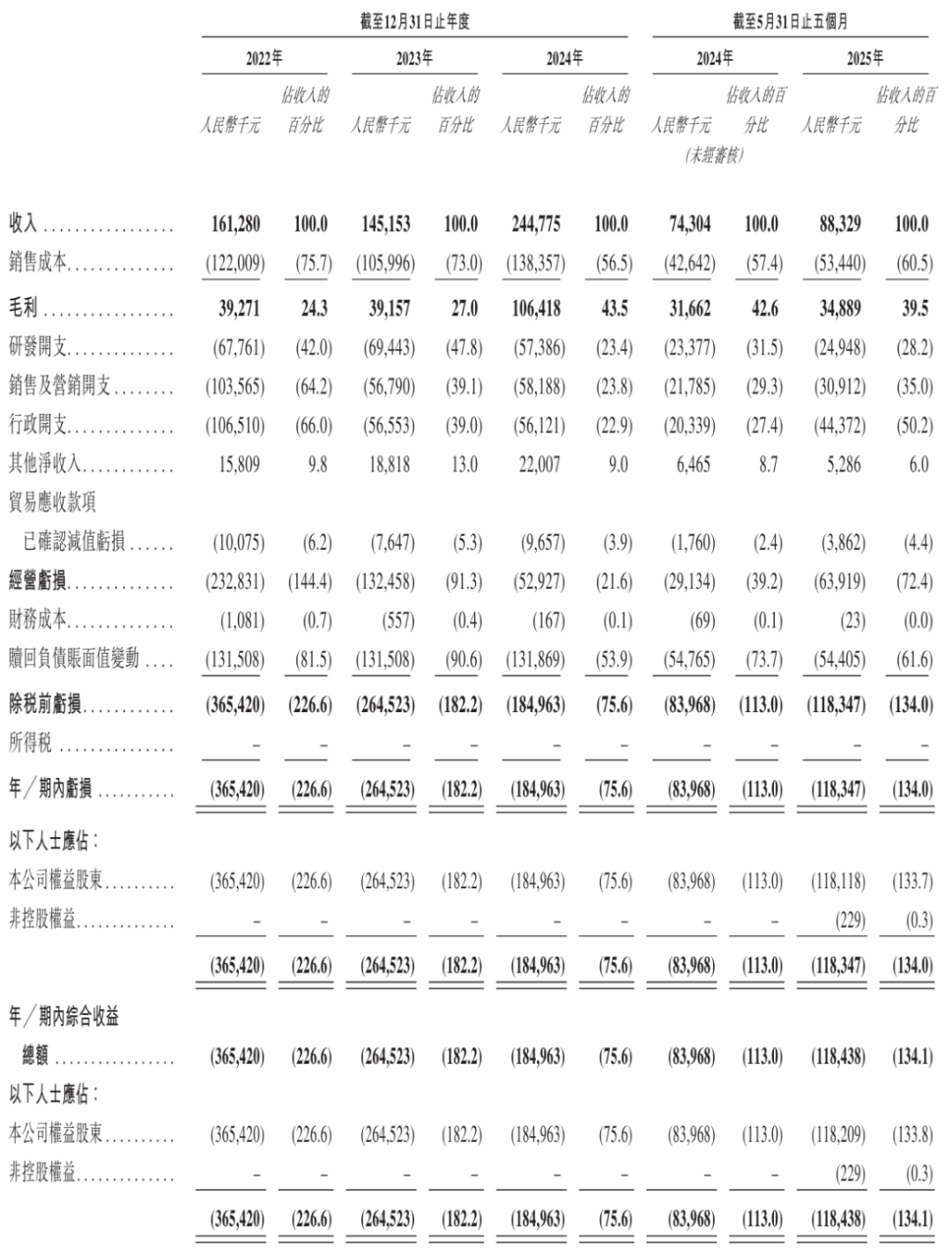 从招股书披露的数据看,云迹科技的财务表现呈现“喜忧参半”的态势。2022年到2024年、2025年前5个月,该公司营收分别为1.61亿元、1.45亿元、2.45亿元、8833万元;毛利率则持续改善,同期分别为24.3%、27%、43.5%、39.5%;亏损3.65亿、2.65亿、1.85亿、1.18亿元,累计亏损超9亿元。