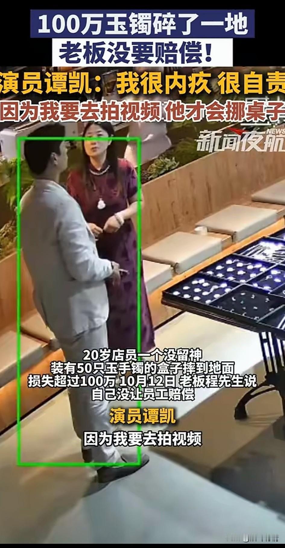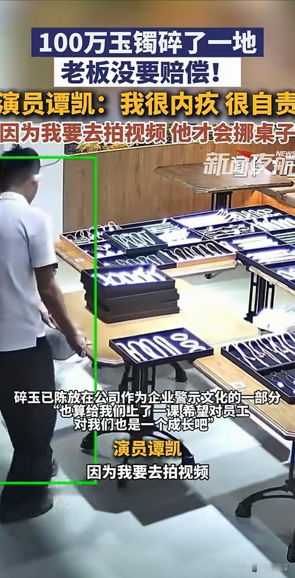 100万玉镯碎一地后续来了, 演员谭凯表示我很愧疚,很自责, 岁岁平安吧! 因为我要去拍视频, 他才会去挪桌子, 一个20岁的店员确实确实被吓坏了, 工资才多少钱真赔不起, 好在老板程先生明事理, 没有让小伙赔偿, 要不然万一小伙想不开, 再出点啥事人没了那才是真悲剧, 这老板能处,大气! 碎玉已经被公司作为一个警示作用的道具了! 所以说在玉器店上班, 还真得处处小心, 要不然摔碎东西可真赔不起, 小伙子以后可长点心吧! 大家觉得玉器店老板程先生是不是当地最大气的老板? 娱乐圈那点儿事 谭凯 玉镯 玉镯事件 玉镯事件 心碎玉镯