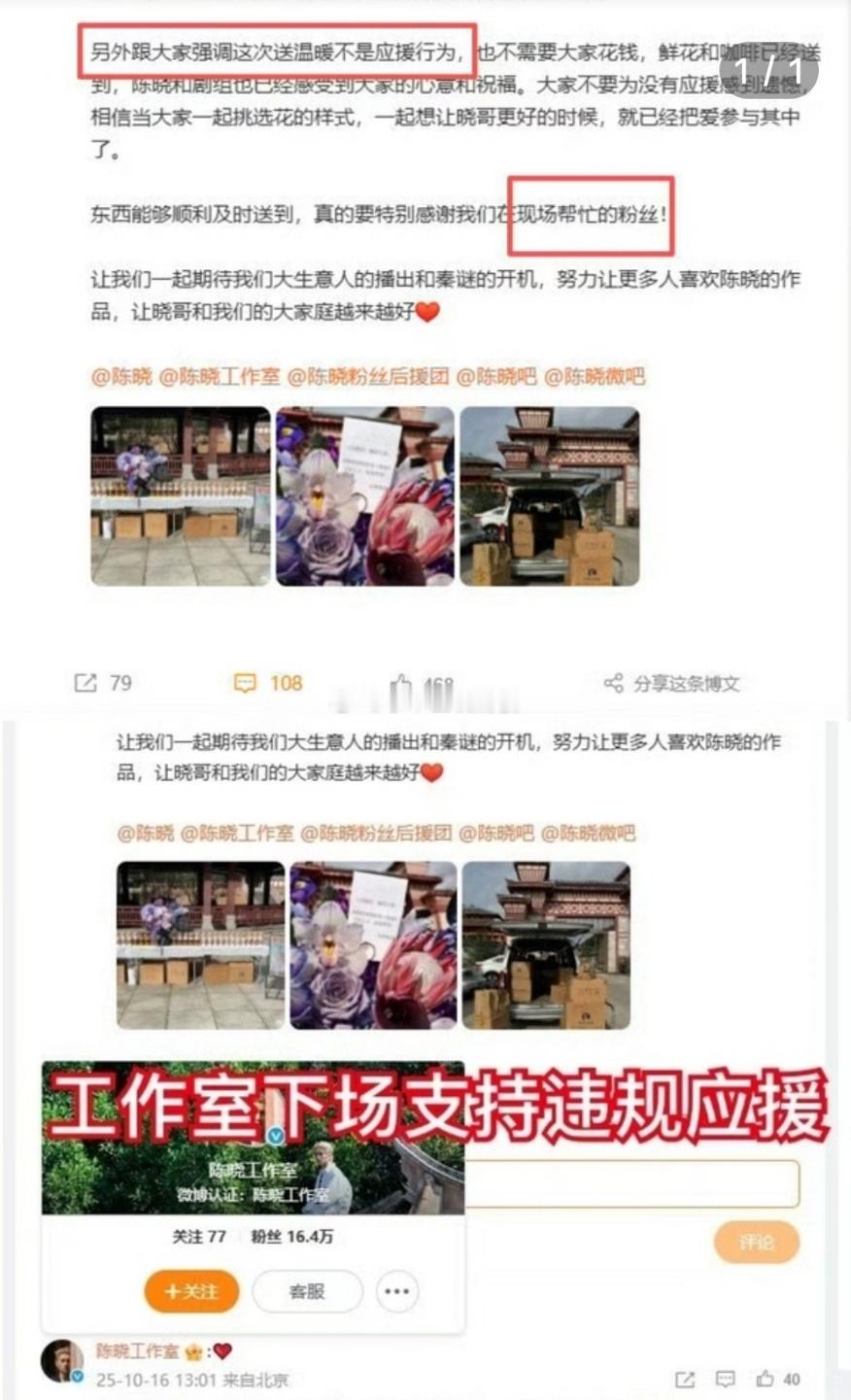 但陈晓粉丝没有,还偷摸进去应援并晒出照片,不敢说是应援,只说是送“温暖”,而且陈晓工作室还认领了这次温暖。